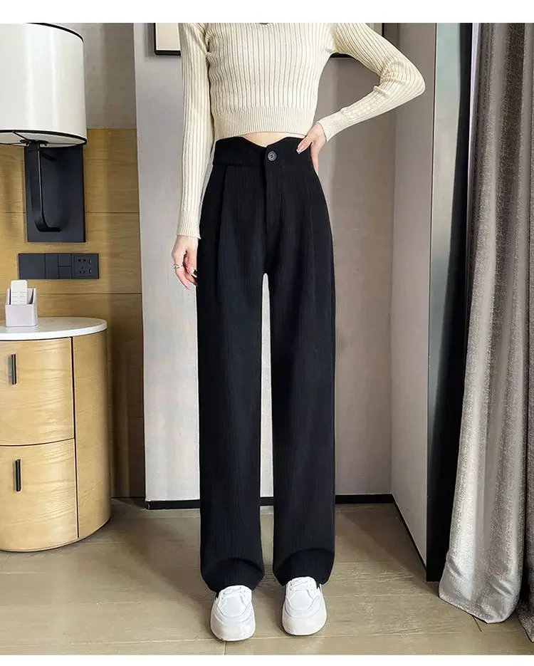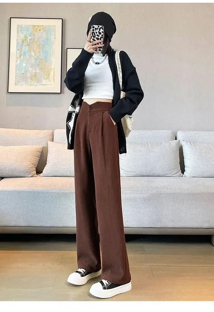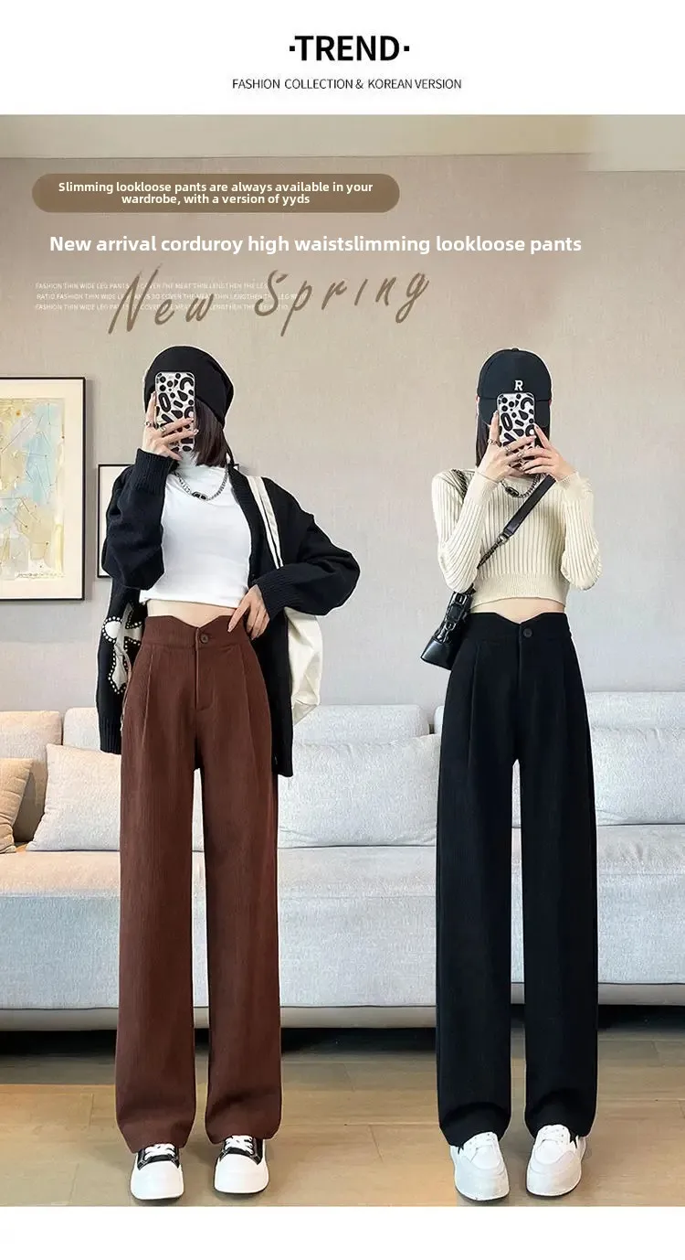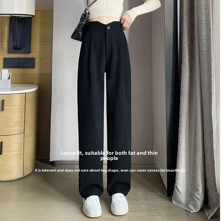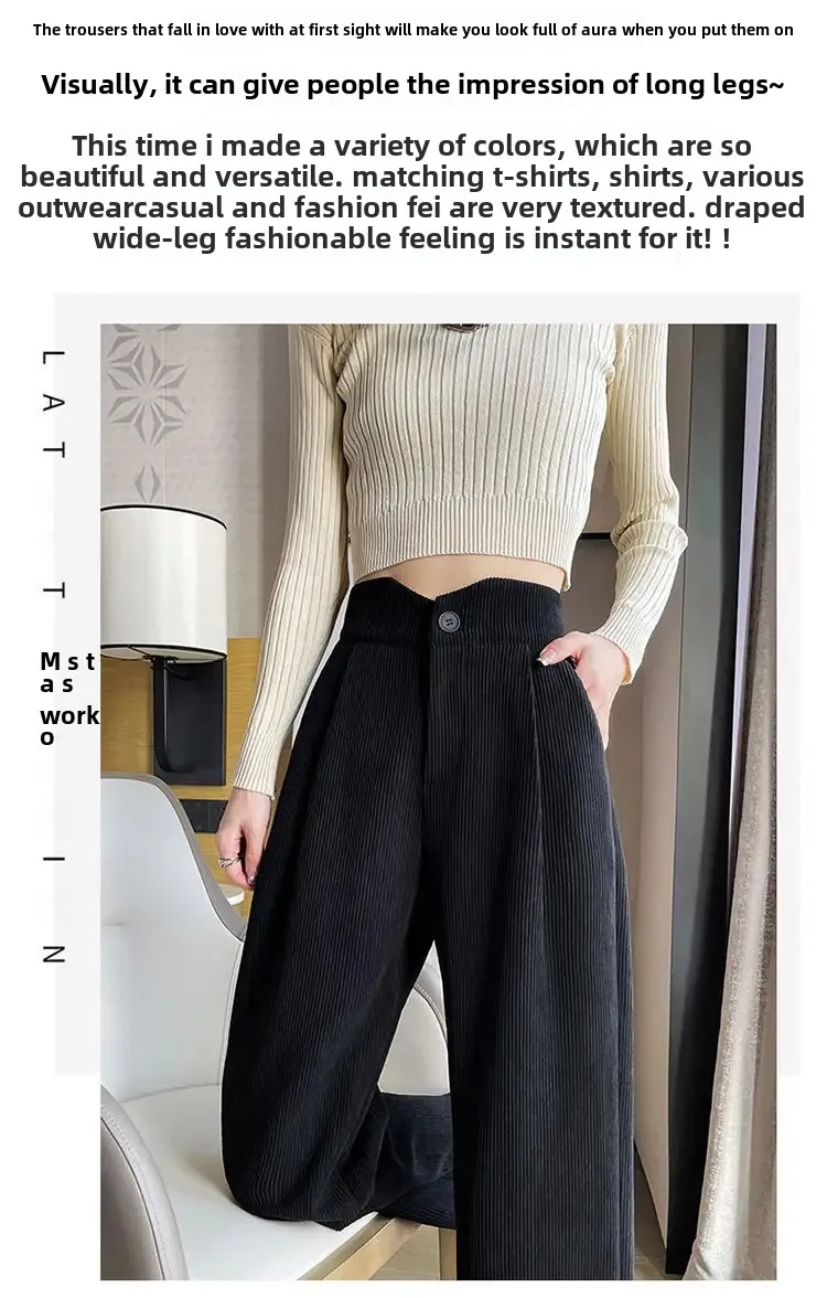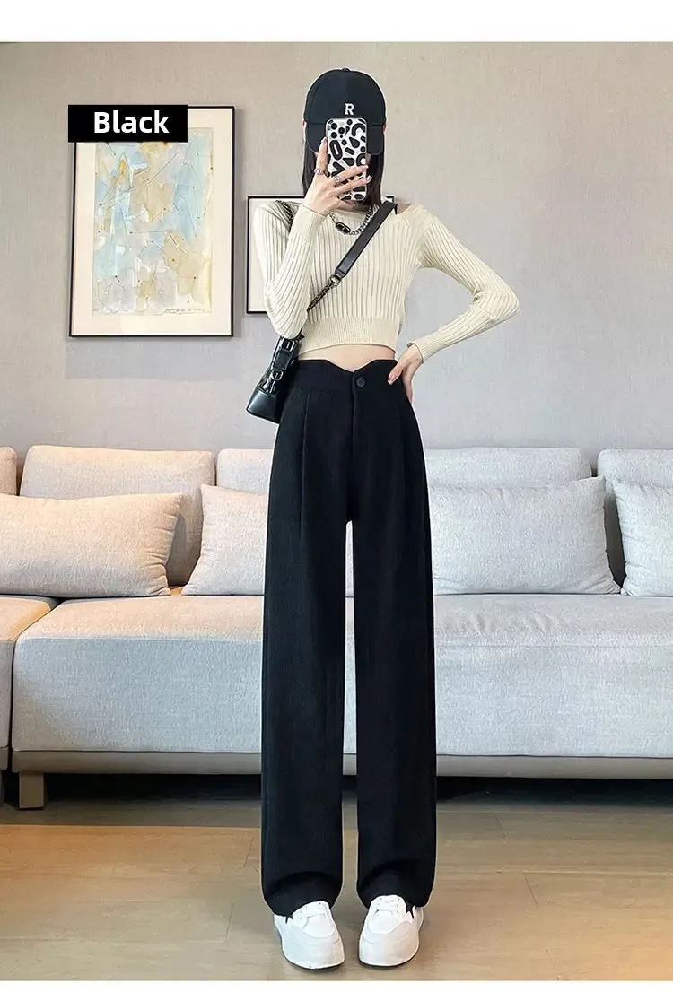 Black High Waist Drapey Chenille Wide Leg Pants Slimming Straight Corduroy Casual Floor-Length Trousers for Women