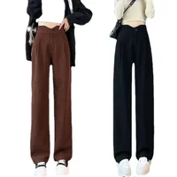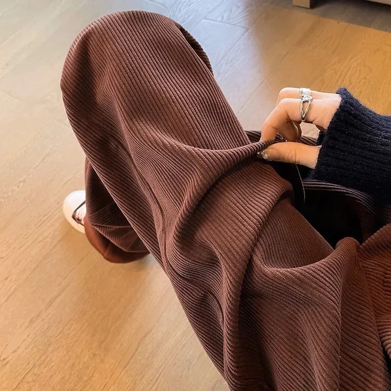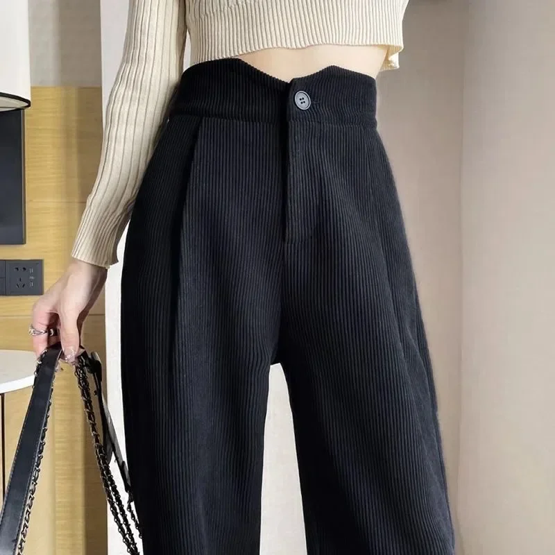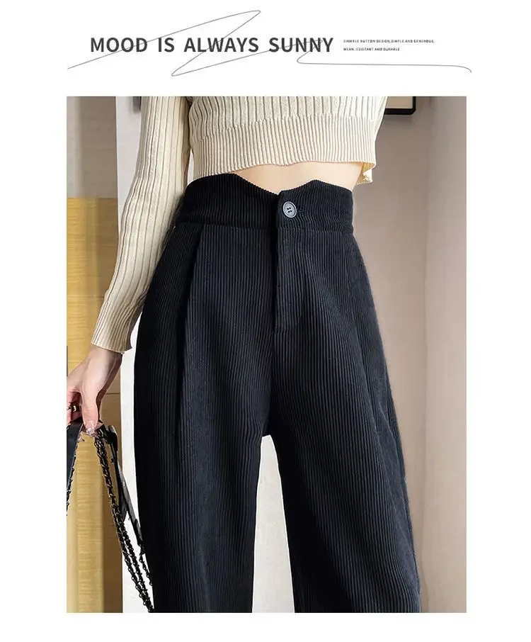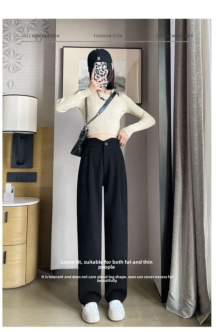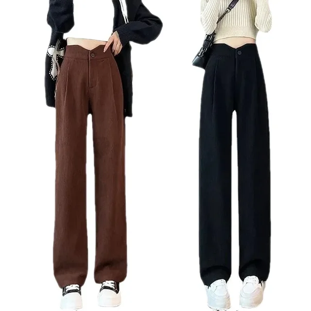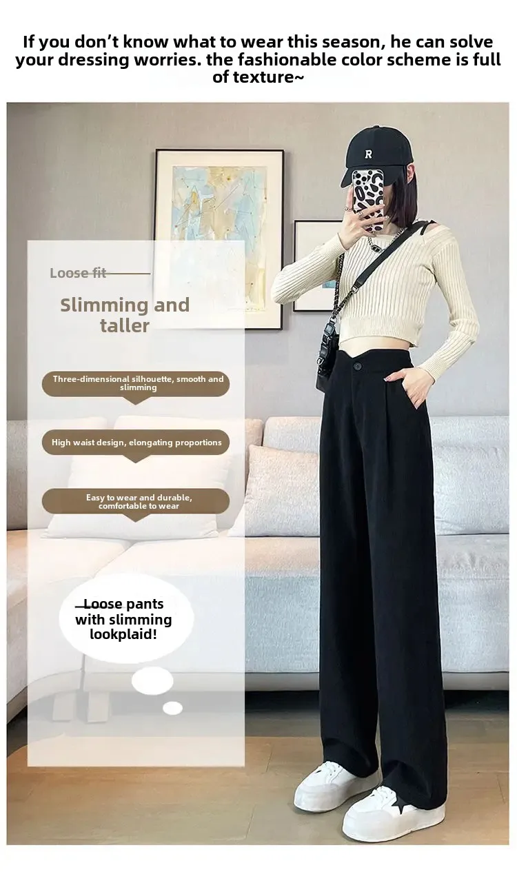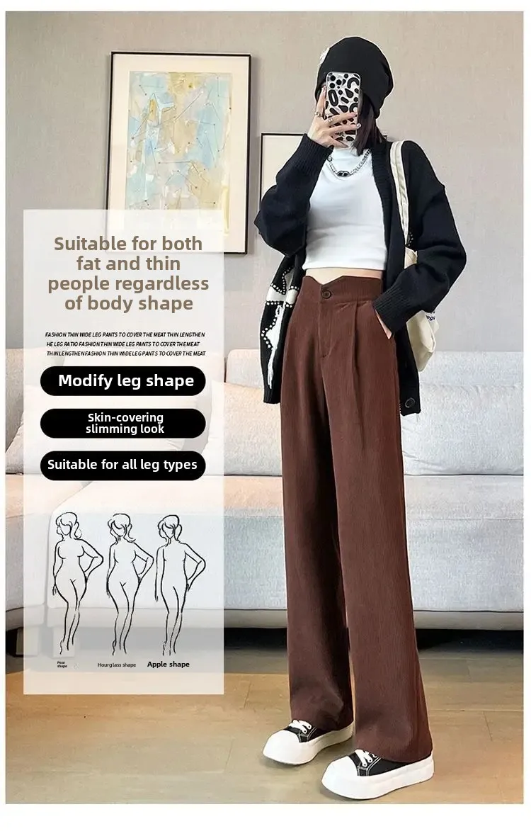 Black High Waist Drapey Chenille Wide Leg Pants Slimming Straight Corduroy Casual Floor-Length Trousers for Women