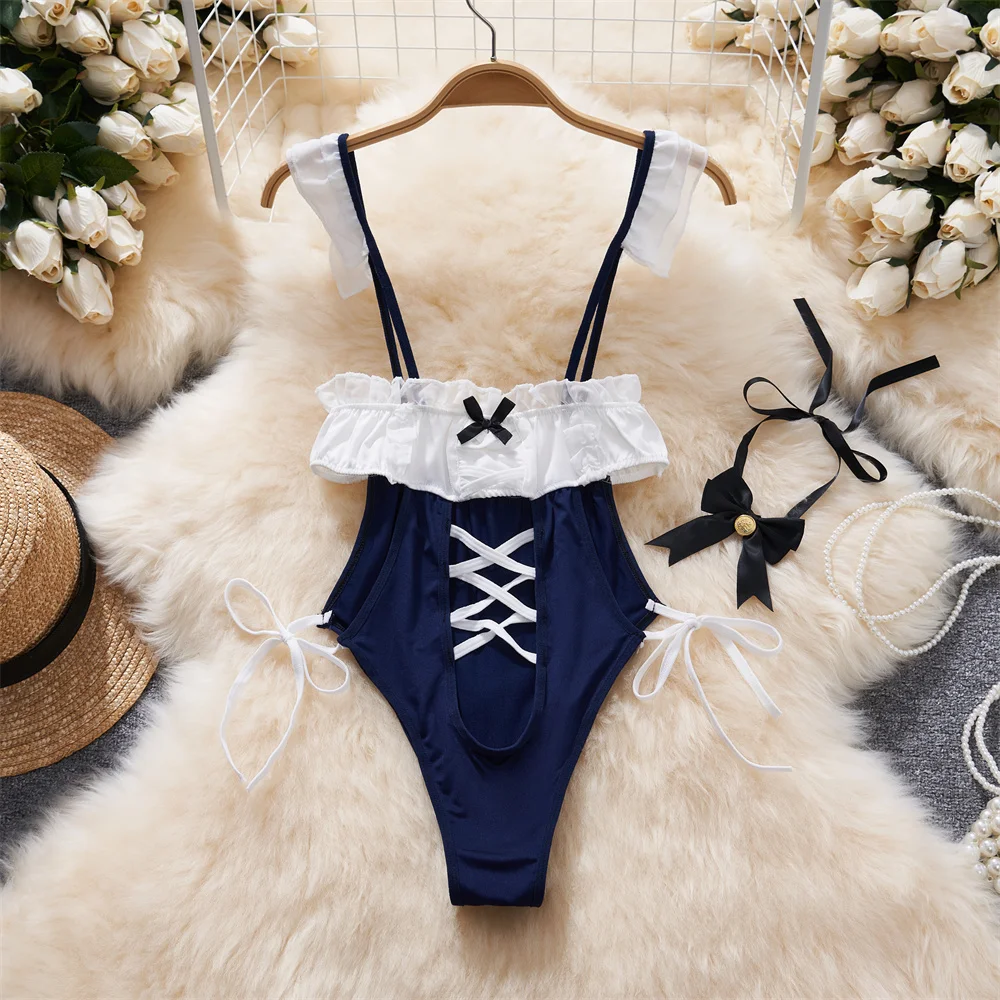 Sweet Sexy Lace Patchwork Strap Dress Bow Hollow Backless Sleeveless Nightgown Women Nightdress Pajamas Hot Slim Pleated Dress
