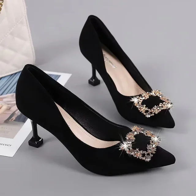 • Elegant Design : Featuring a sleek black rhinestone square buckle and pointed shallow mouth, these heels exude elegance and sophistication.