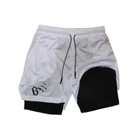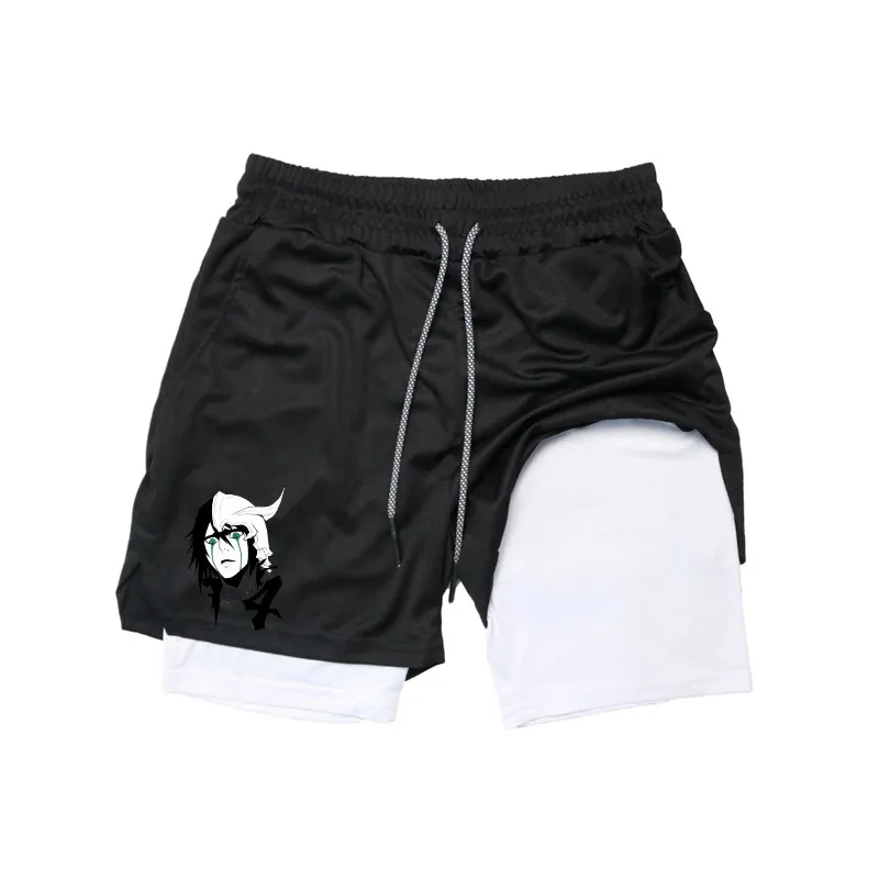 Bleach Print 2in1 Running Workout Shorts Men Gym Performance Compression Shorts with Phone Pocket Towel