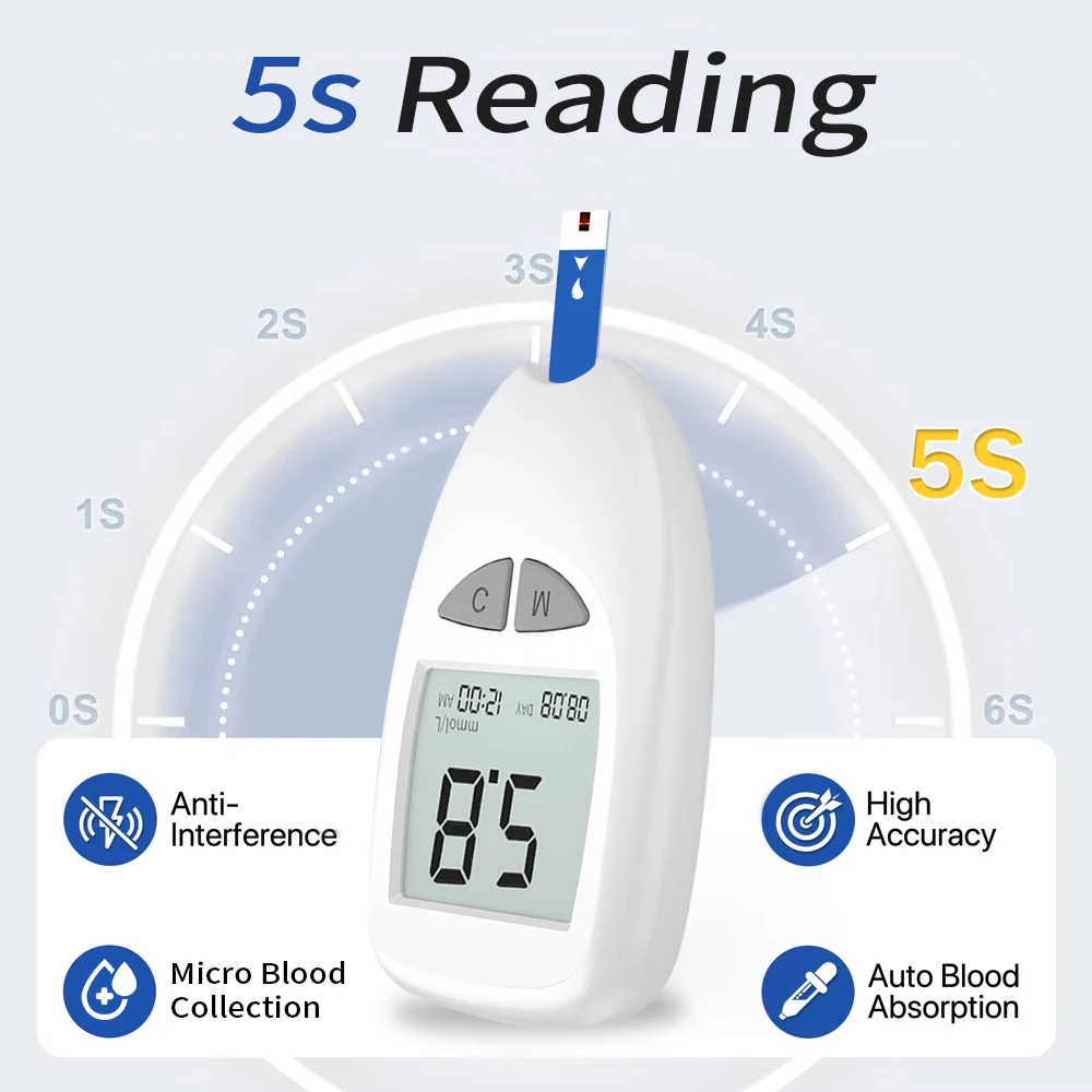 50pcs Meter Kit: 1 Meter(mg/dL & mmol/L) + 1 Lancing device + 50 Test Srips + 50 Lancets