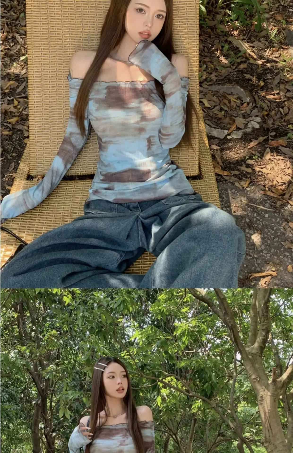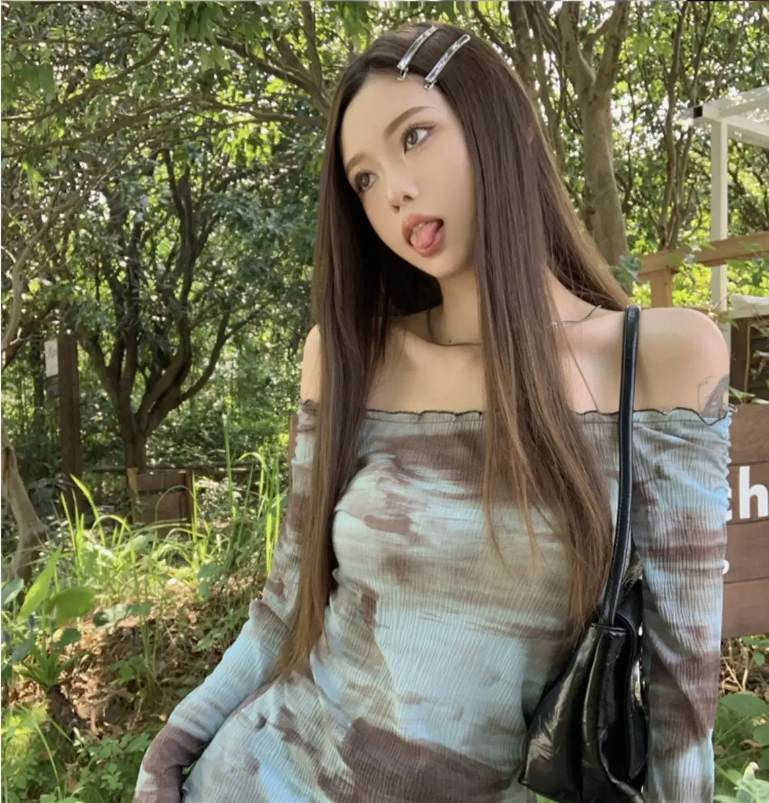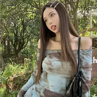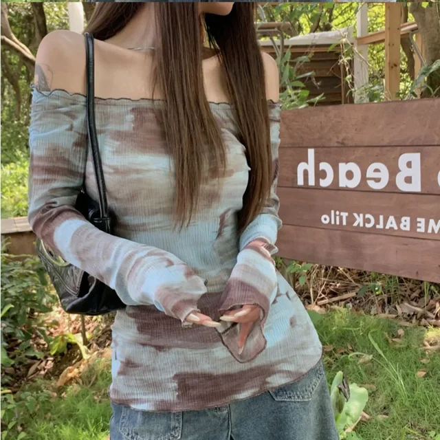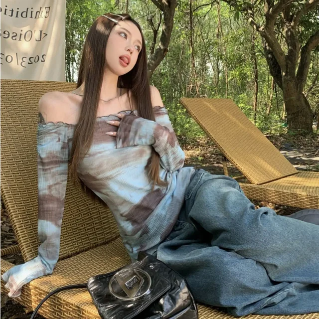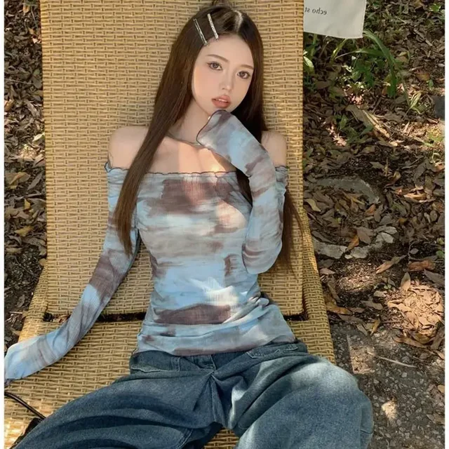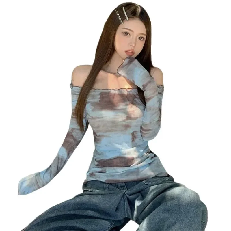 Blue American Style Spicy Girl Long Sleeve T-Shirt Women Summer Tie Dye Shoulder Bared Slim Fit Top Polyester Fiber
