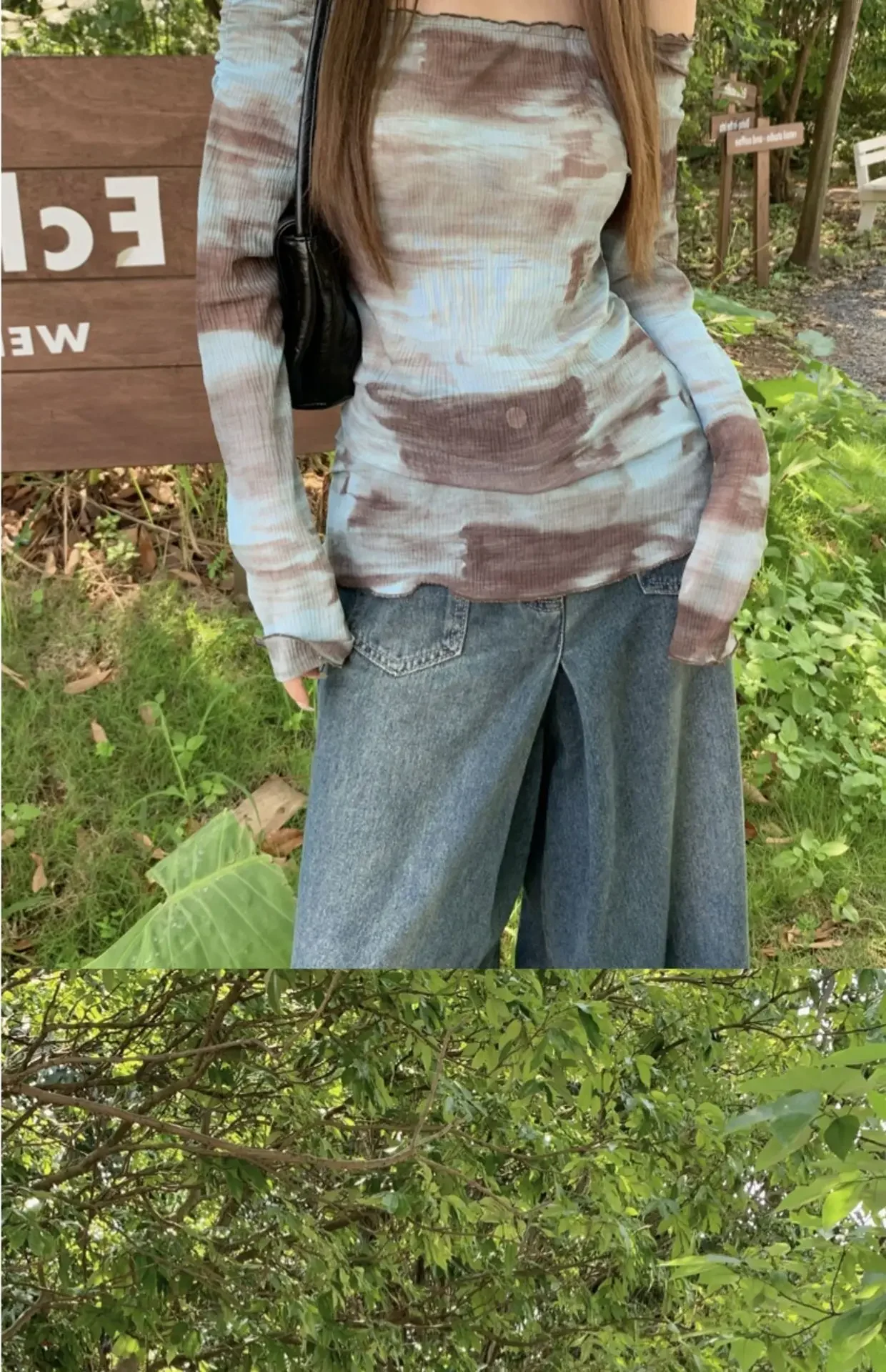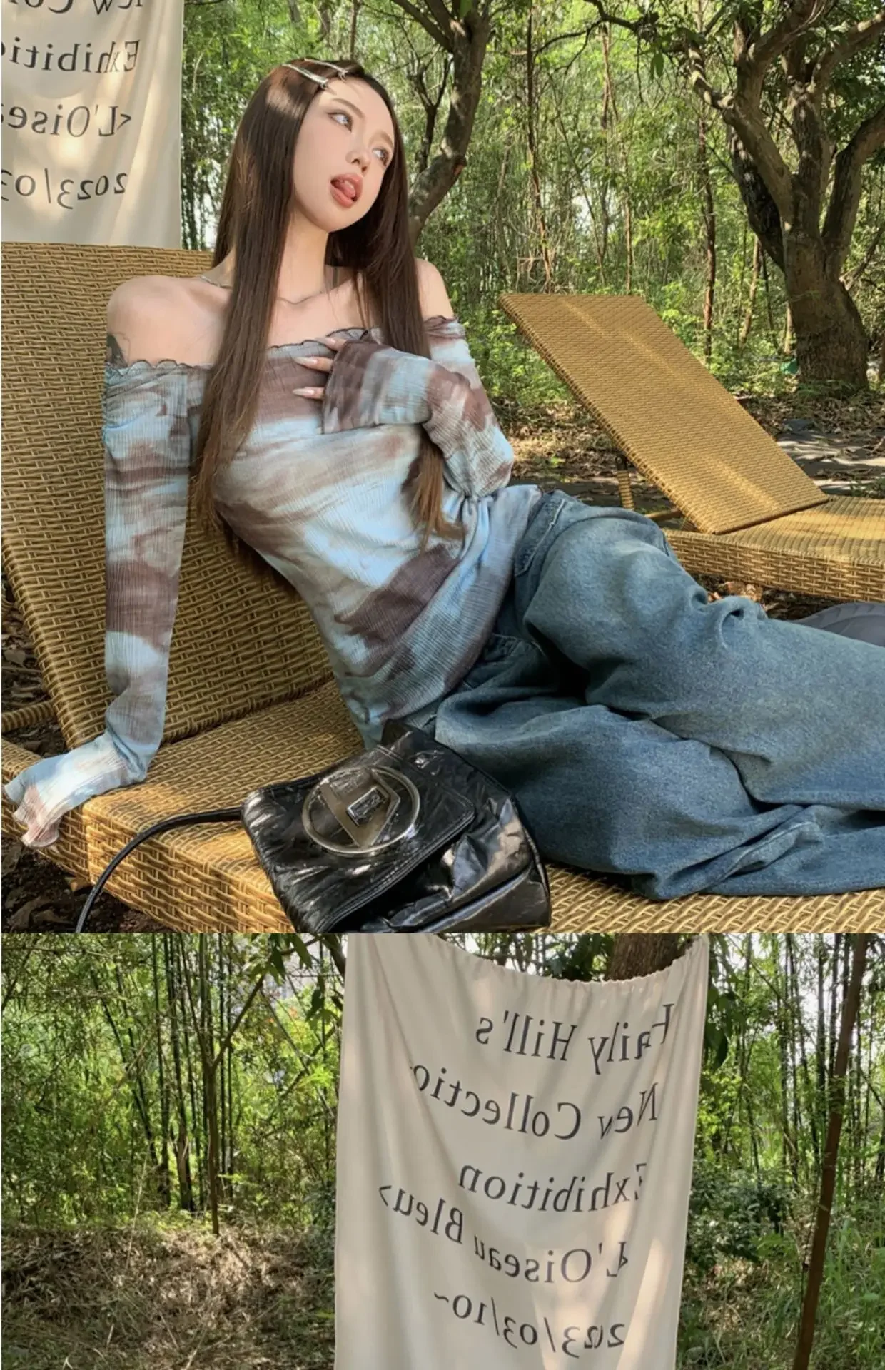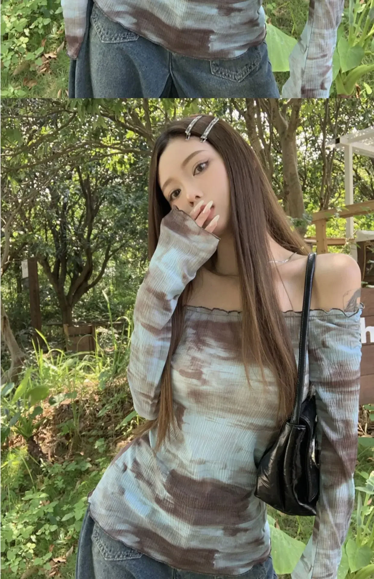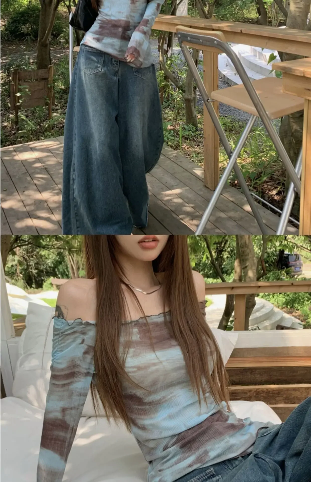 Blue American Style Spicy Girl Long Sleeve T-Shirt Women Summer Tie Dye Shoulder Bared Slim Fit Top Polyester Fiber