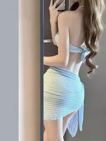 This bikini set features a sleek, high-end blue color that exudes elegance and sophistication, perfect for a beach vacation.