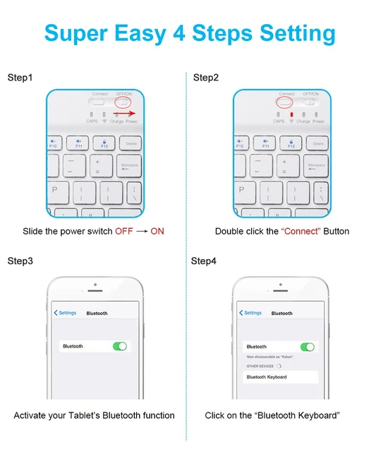 3: Turn on the Bluetooth switch of the device such as tablet/smartphone, search for Bluetooth device, the default Bluetooth name of the keyboard: Bluetooth Keyboard.