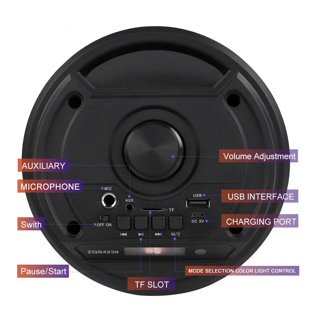 Features: 1.Multi-Functionality: This BT speaker features Bluetooth-compatible, radio, USB/TF card, and MIC inputs, providing a wide range of options to play your music effortlessly and with style. 2.Vibrant LED Lights: Equipped with adjustable LED lights, this portable speaker enhances any party atmosphere by syncing the light effects to your favorite tunes. 3.Surround Sound: Our wireless stereo speaker delivers immersive surround sound for an upgraded audio experience that impresses with every use. 4.Multiple Connectivity Options: Easily change between different music sources with support for radio, microphone input, and storage card playback on this versatile loud boombox. 5.Portable and Easy to Carry: The outdoor speaker is lightweight and compact, with a convenient handle for easy transport to any location, making it a great choice for parties in various settings.