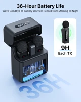 The transmitter features an in-built microphone, and a belt clip that pivots360 degrees for flexible positioning of the transmitter on clothes.The BY-Voffers multiple confgurations with three kinds of receiver options thatsupport USB-C, Lightning, and 3.5 mm TRS outputs, making it widelycompatible with smartphones, computers, cameras. All these threereceivers allow users to play audio directly without unplugging thereceiver. Additionally, when using the BY-V-RXU or BY-V-RXD receiver witha smartphone, the receiver’s USB-C port can be connected to a chargingcable for charging the phone.The BY-V-RX receiver supports mono andstereo recording modes, providing fexibility for different recordingscenarios. Each transmitter delivers 9 hours of recording time on a singlecharge.Additionally, the charging case allows you to charge transmitterswhile on the go.