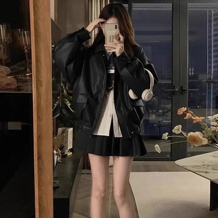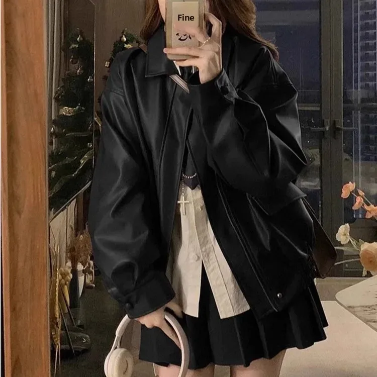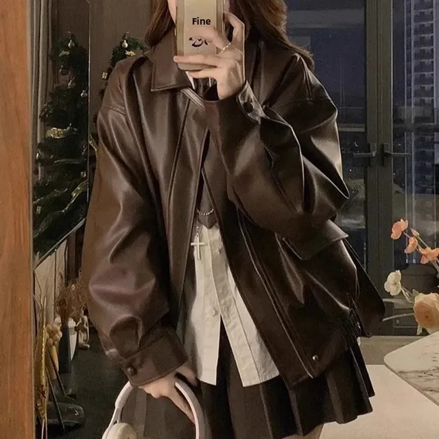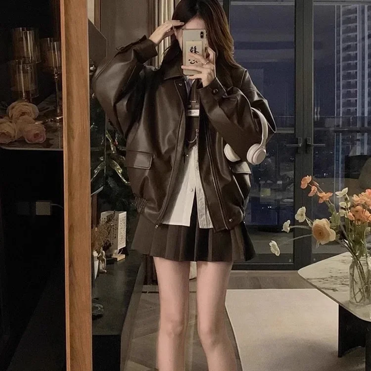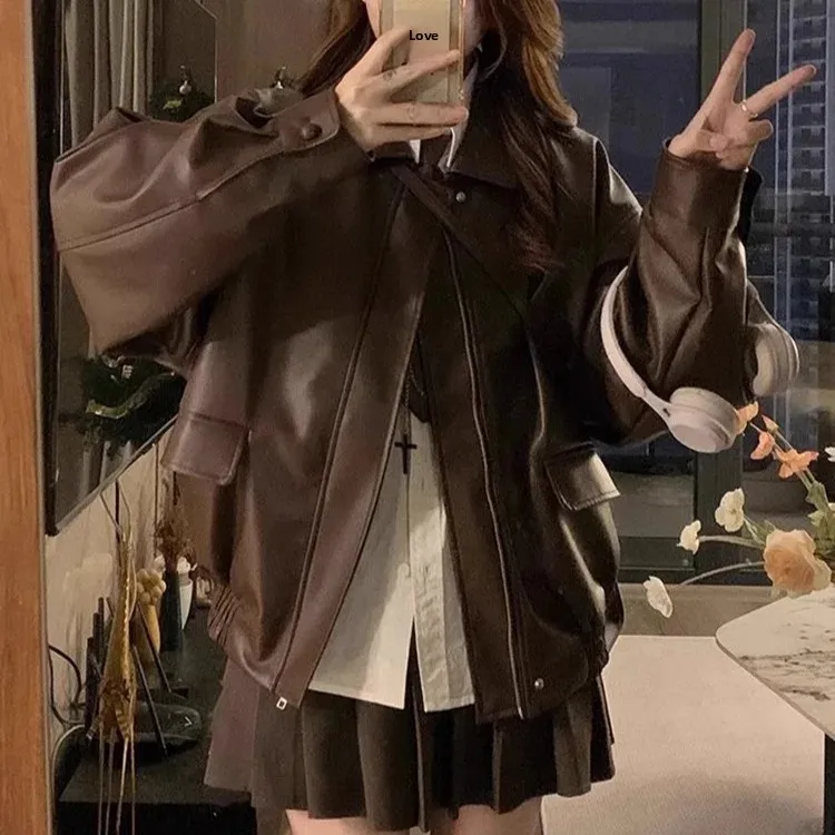Brown Leather Jacket Women's Loose Long Sleeve Autumn Korean Version Hot Sale Of The Season New Cool Girl Motorcycle Style Top S