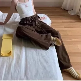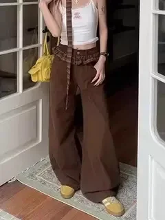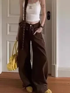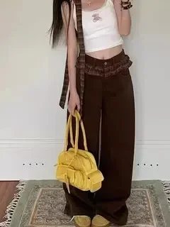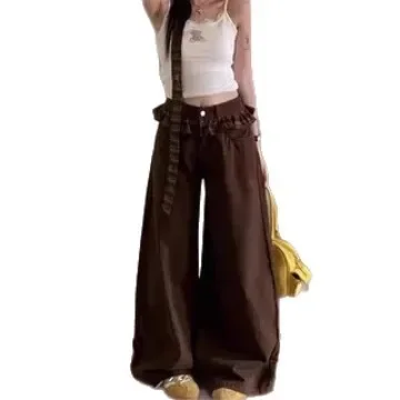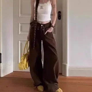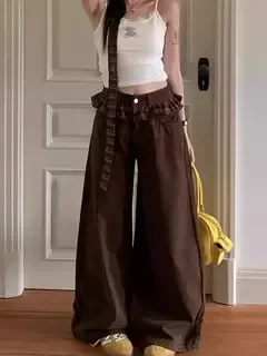 Brown Mermaid Butterfly Knot Wide Leg Jeans Women's Loose Fit High Waist Dual Waist Spring Autumn Design Straight Loose Pants