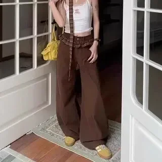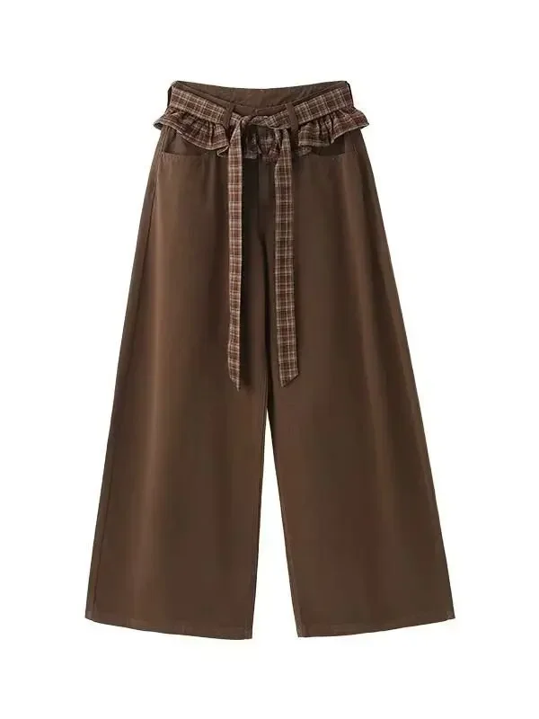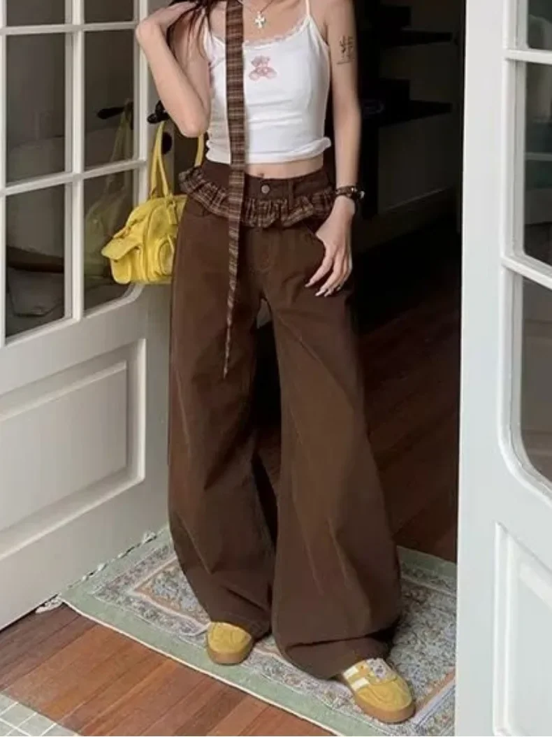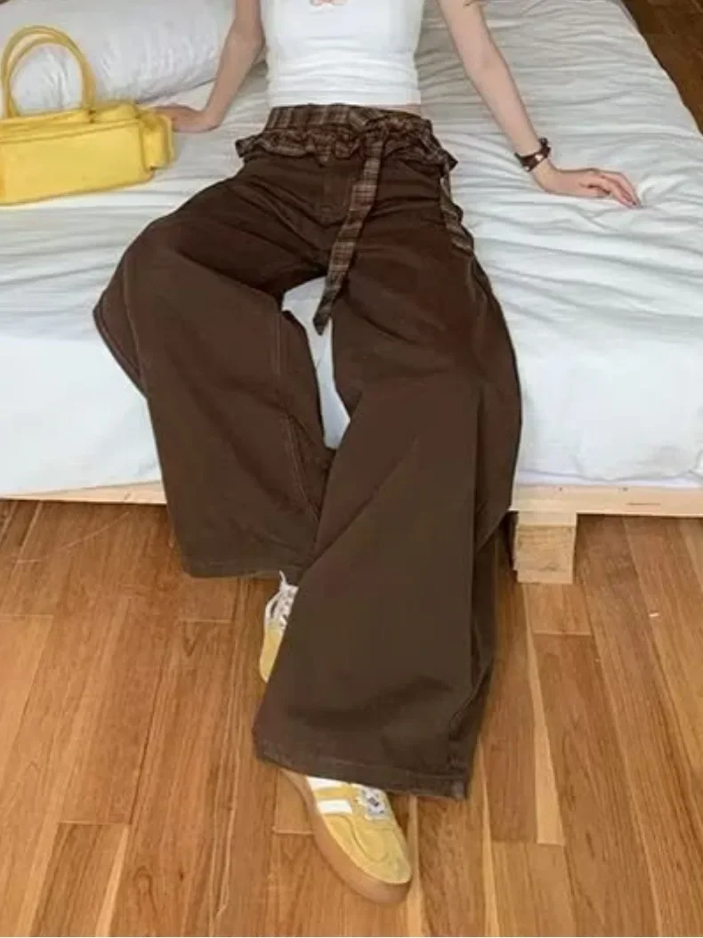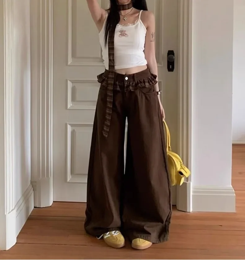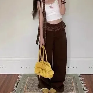 Brown Mermaid Butterfly Knot Wide Leg Jeans Women’s Loose Fit High Waist Dual Waist Spring Autumn