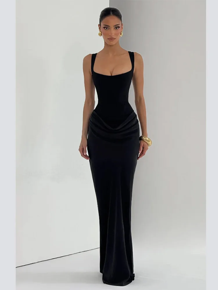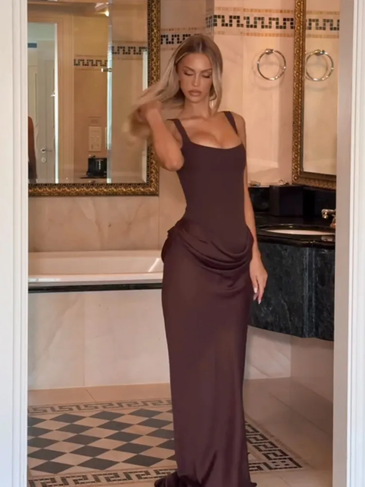 BROWN Pleated Sling MAXI Dress Women Square Neck Sleeveless Off-shoulder Waist Cinching Slim ROBE Fashion