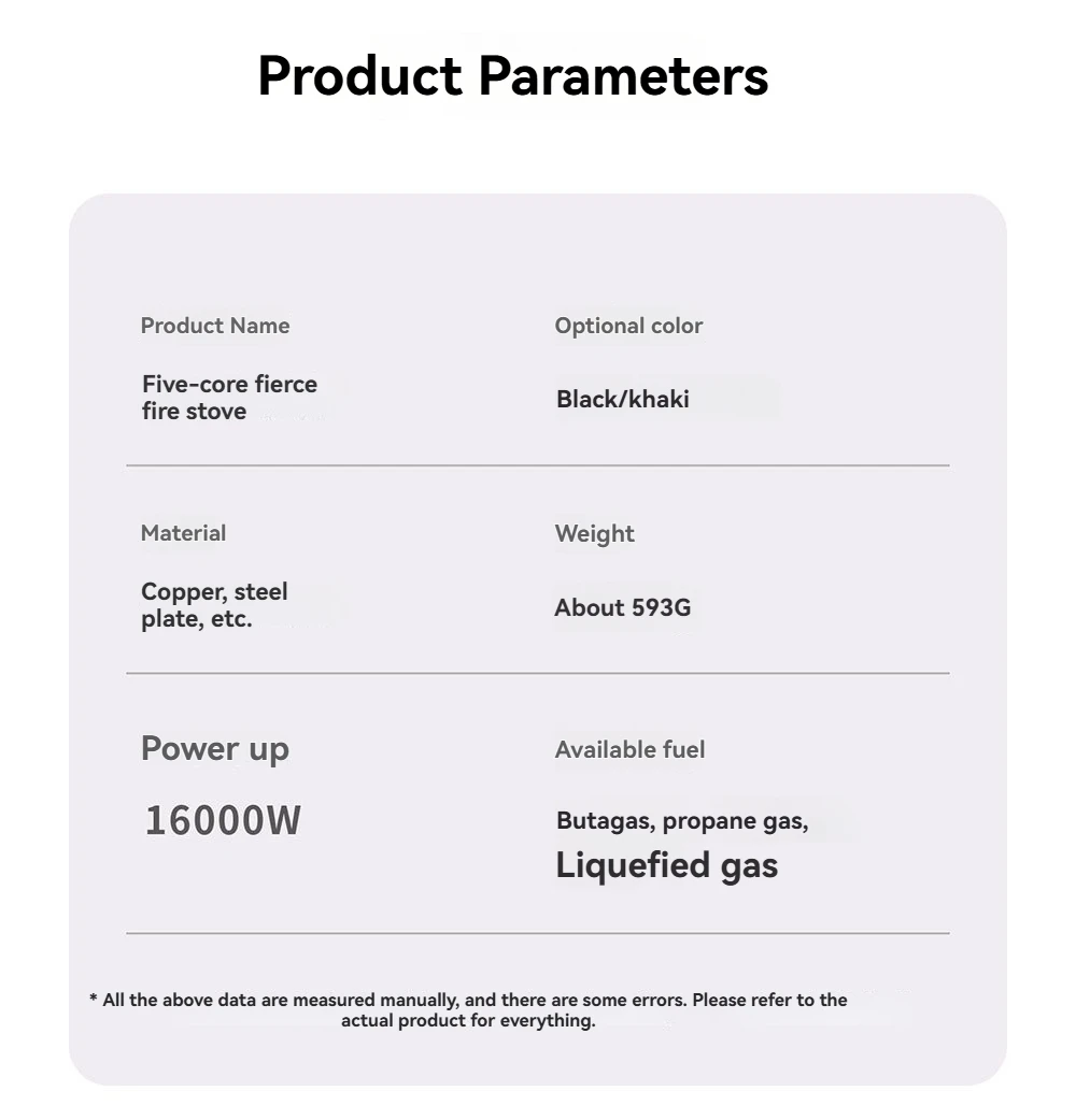 Available fuels include butane gas, propane gas, and liquefied gas