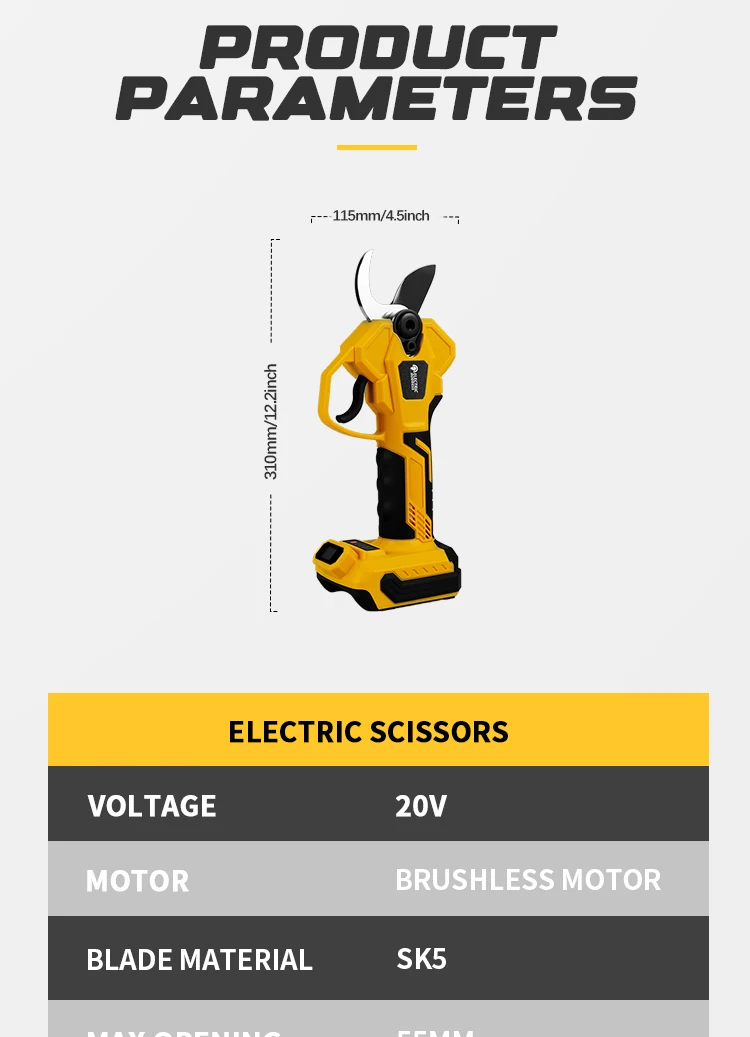 – Brushless electric scissors, with four-level size adjustment for cutting, the maximum cutting diameter is 30 millimeters, and they can be easily used for cutting.