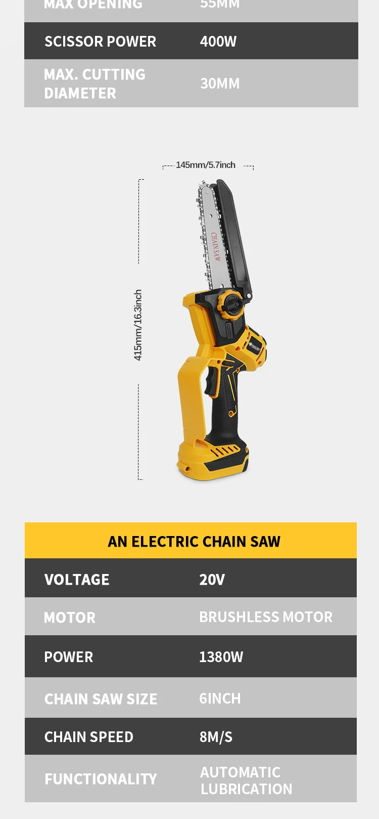 – Chainsaw is equipped with quick fix chain, automatic lubrication, intelligent temperature control.