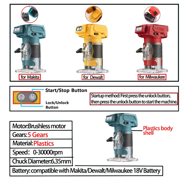 Brushless Trimmer for Woodworking 18V Compatible with Makita Dewalt MK Wood Router Milling Engraving
