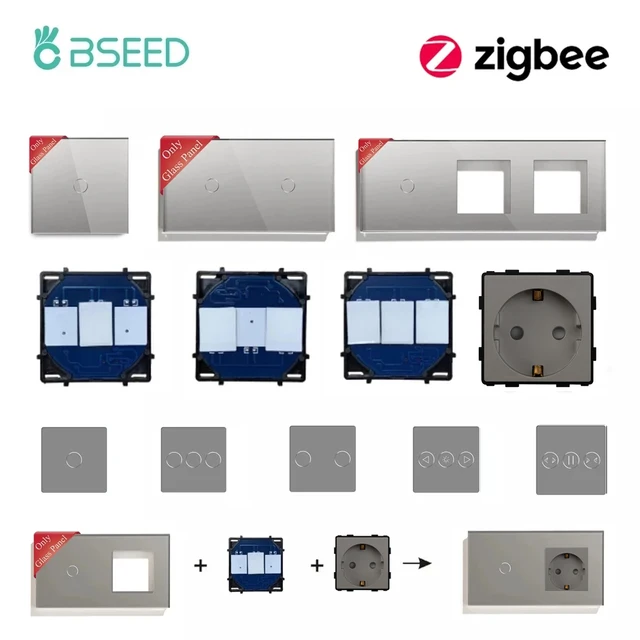 BSEED Tuya Zigbee Smart Light Switches Touch Glass Panel Frames For Wall Sockt Plug Power Outlets Google Alexa Control DIY Parts