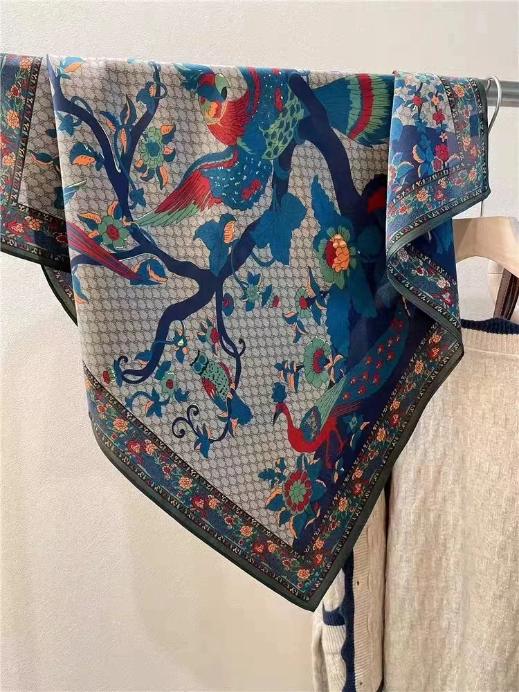 BYSIFA| New Grey Blue Silk Scarf Fashion Floral Design 70cm Square Scarves Fall Winter Neck Scarf Hijab