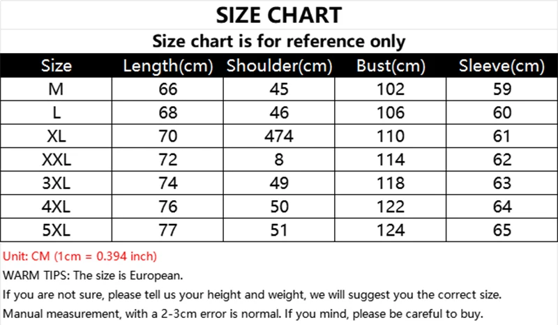 | size_info | {"sizeInfoList":[{"length":{"cm":"102","inch":"40.16"},"size":"M","vid":361386},{"length":{"cm":"106","inch":"41.73"},"size":"L","vid":361385},{"length":{"cm":"110","inch":"43.31"},"size":"XL","vid":100014065},{"length":{"cm":"114","inch":"44.88"},"size":"XXL","vid":4182},{"length":{"cm":"118","inch":"46.46"},"size":"XXXL","vid":4183},{"length":{"cm":"122","inch":"48.03"},"size":"4XL","vid":200000990},{"length":{"cm":"124","inch":"48.82"},"size":"5XL","vid":200000991}]} |