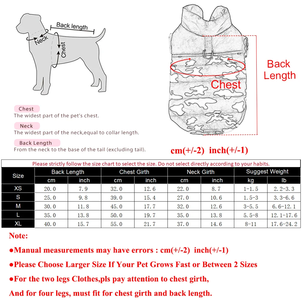 2.Please Choose Larger Size If Your Pet Grows Fast or Between 2 Sizes For the two legs Clothes,please pay attention to chest girth,And for four legs, must fit for chest girth and back length.
