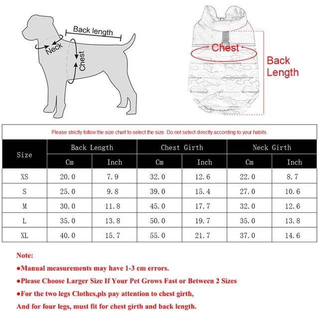 2.Please Choose Larger Size If Your Pet Grows Fast or Between 2 Sizes For the two legs Clothes,please pay attention to chest girth,And for four legs, must fit for chest girth and back length.