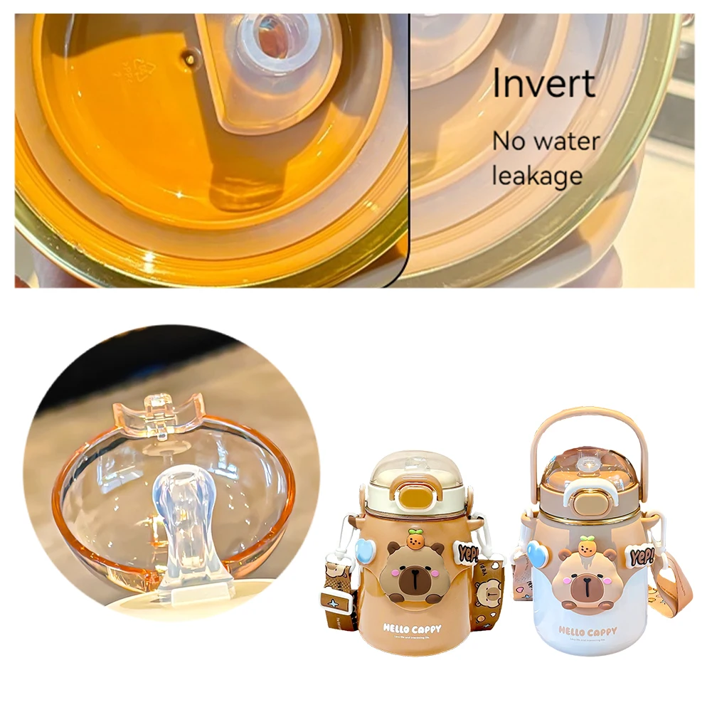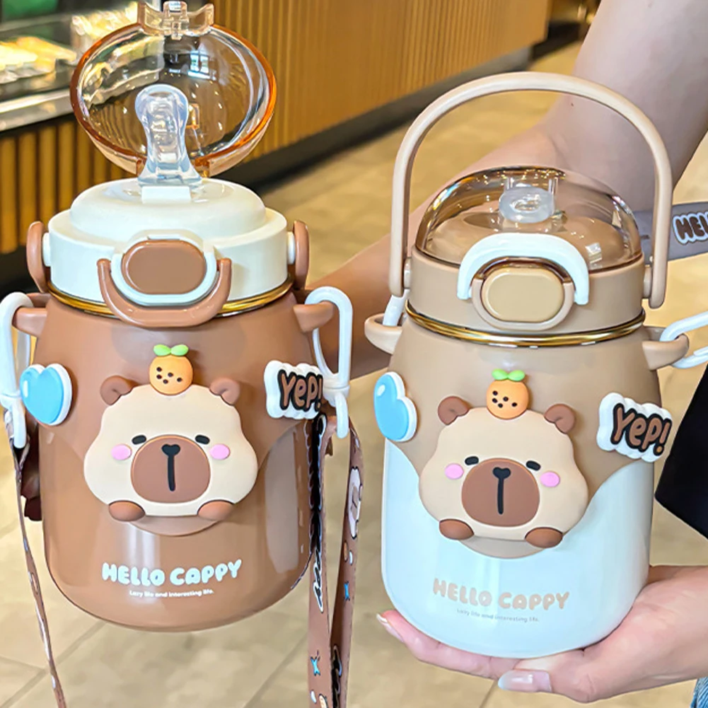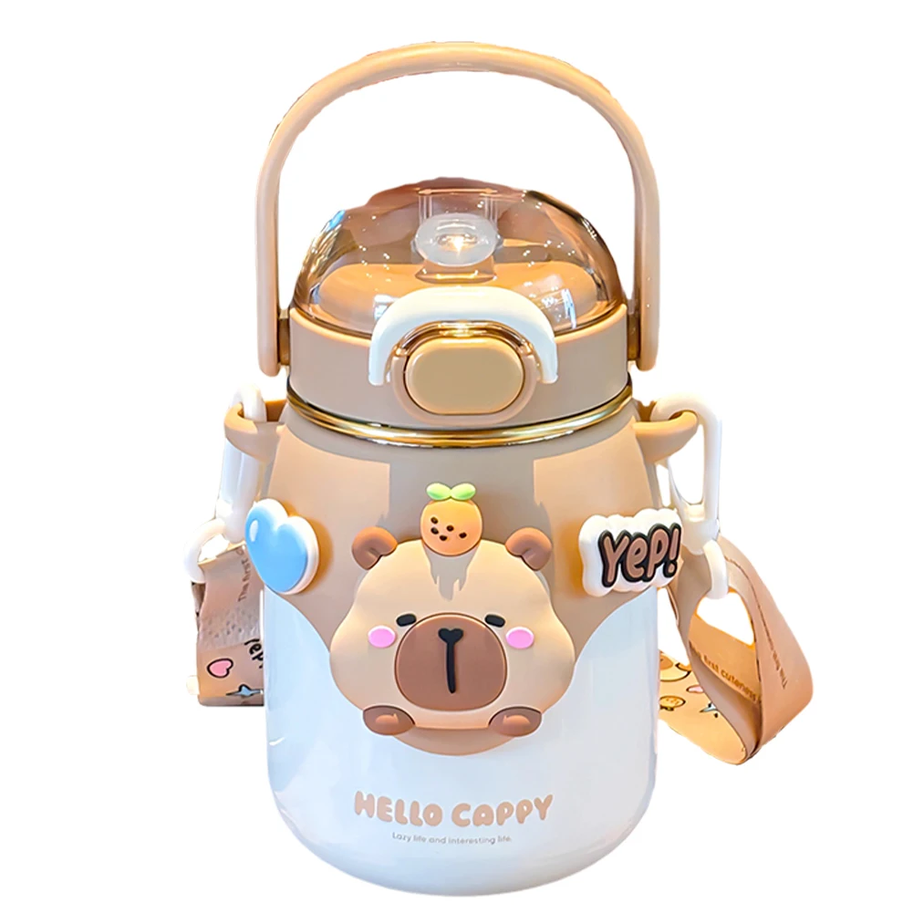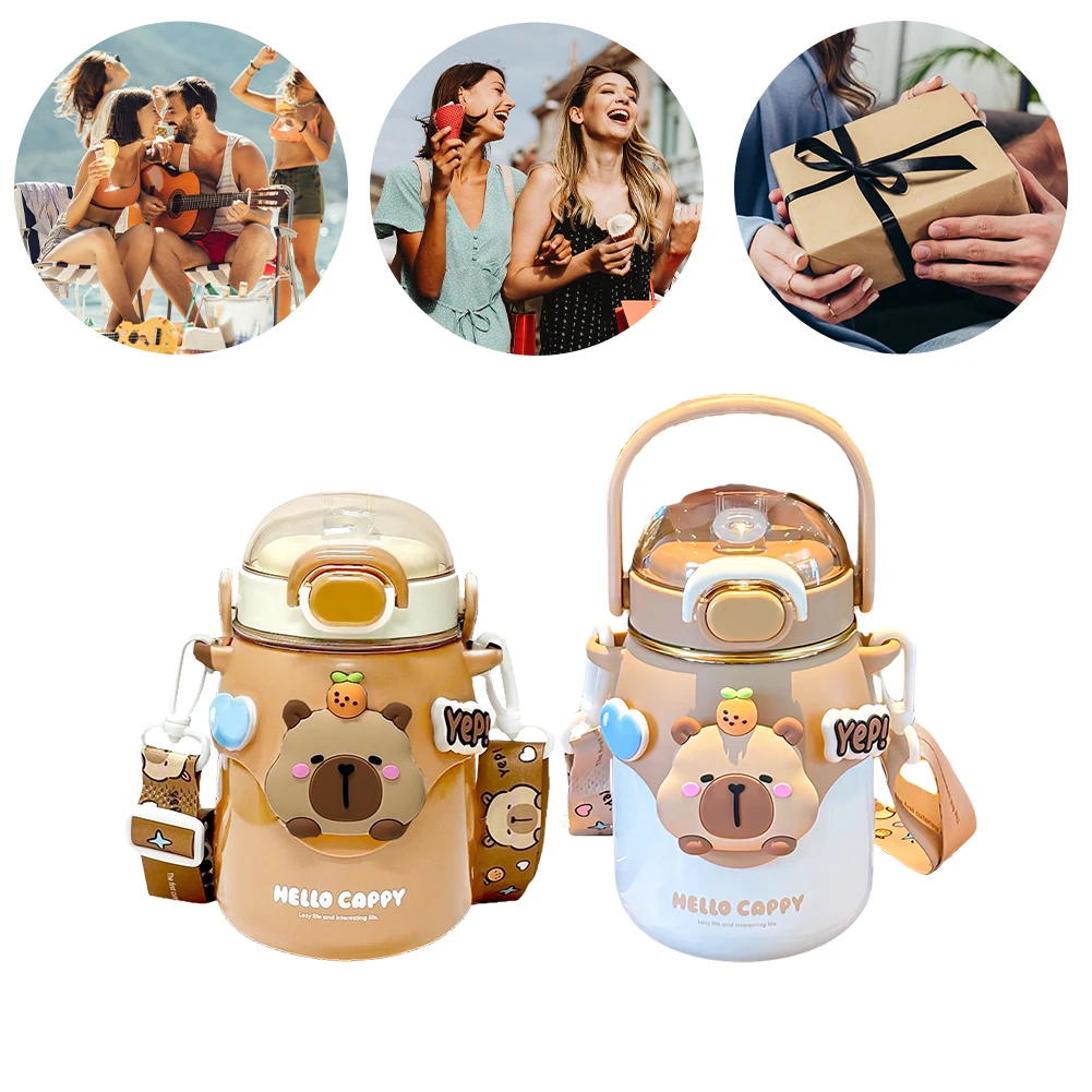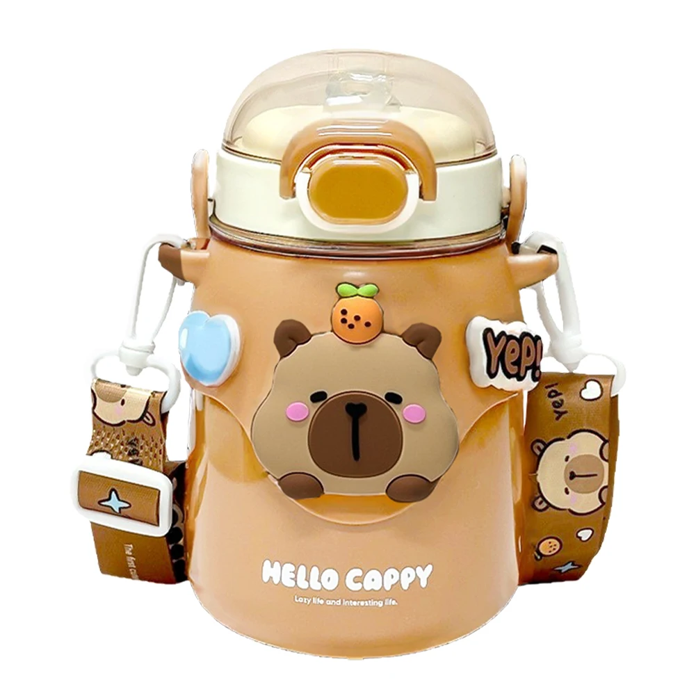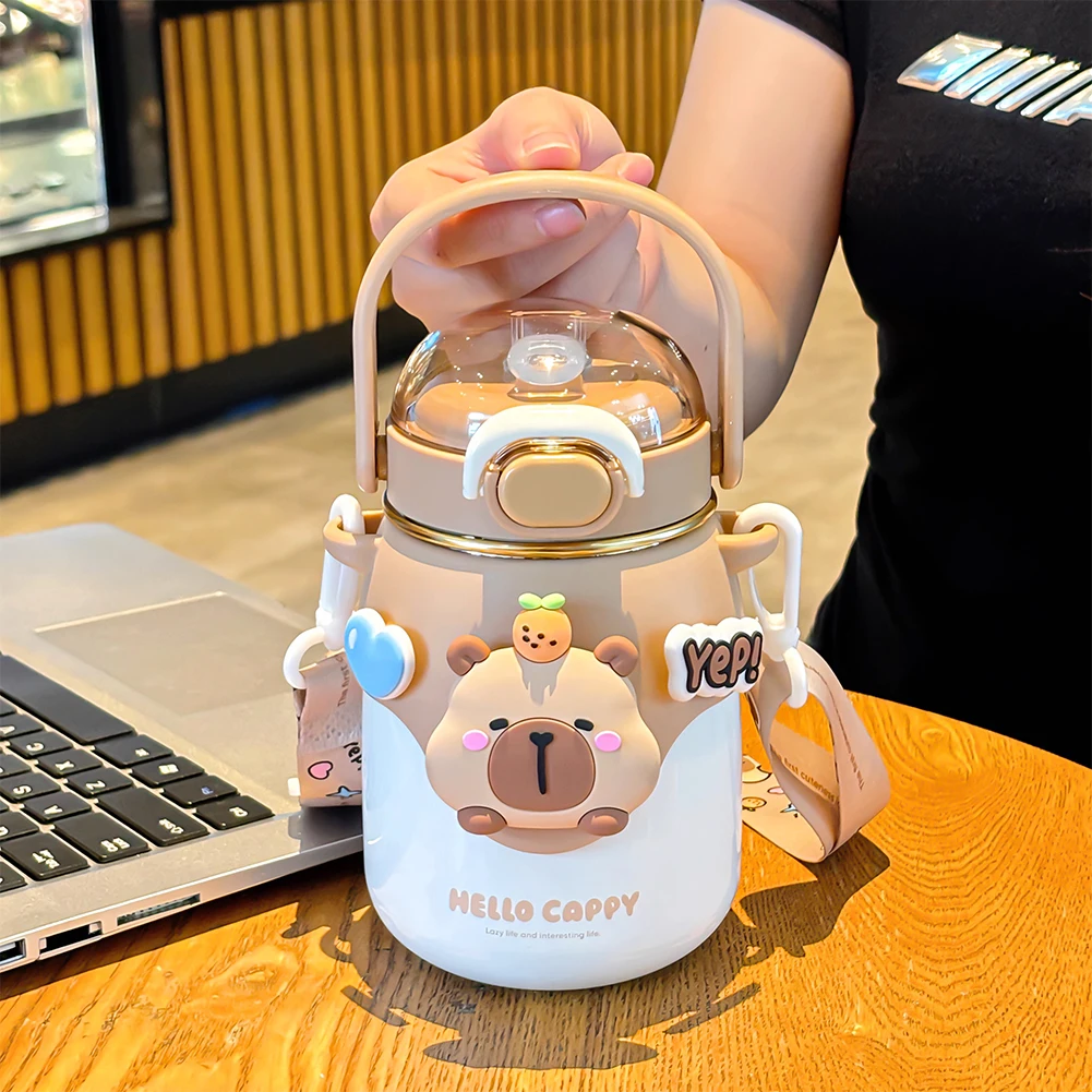 Features: 1.Flexible Transportation: Enjoy seamless transitions between shoulder and hand-carry with the adjustable strap, designed for travel, sports, or commuting. Practical and easy to adapt with your busy lifestyle. 2.Food-Grade Materials: Crafted with food-grade silicone straw and SUS 316 stainless steel inner liner, this drink water cup offers a safe, lasting drinking experience free from harmful substances. 3.Leak-Proof Convenience: Equipped with a flip-top and integrated straw, the cartoon water bottle ensures leak-proof performance, simplifying operation for a cleaner daily hydration process. 4.Boost Daily Hydration: The summer drink bottle features a delightful capybara-themed design to encourage increased water intake while maintaining portability and ease during daily activities. 5.Adorable and Fun Design: for classes or outdoor activities, the travel tumbler with its vibrant patterns attracts young users, ensuring it stands out while promoting healthy hydration habits in every setting. Specification: