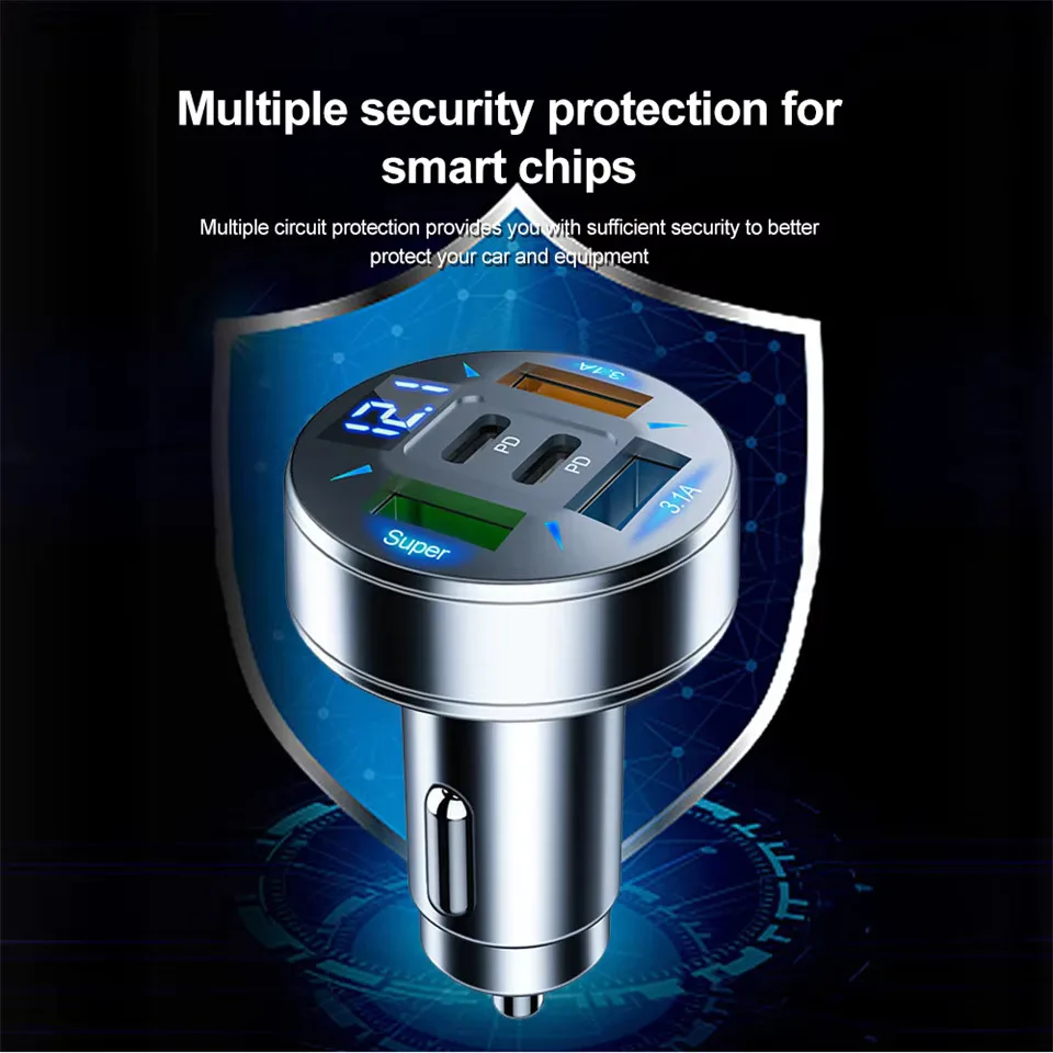 Car Charger 250W 5 Ports Fast Charging PD QC3.0 USB C Car Phone Charger Adapter With Voltage For iPhone