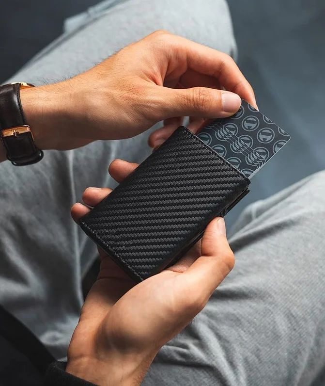 Price range: 7.96$ through 8.12$Carbon Fiber & Aluminum Men’s Bifold Wallet, RFID Blocking Automatic Pop-Up Card Holder with