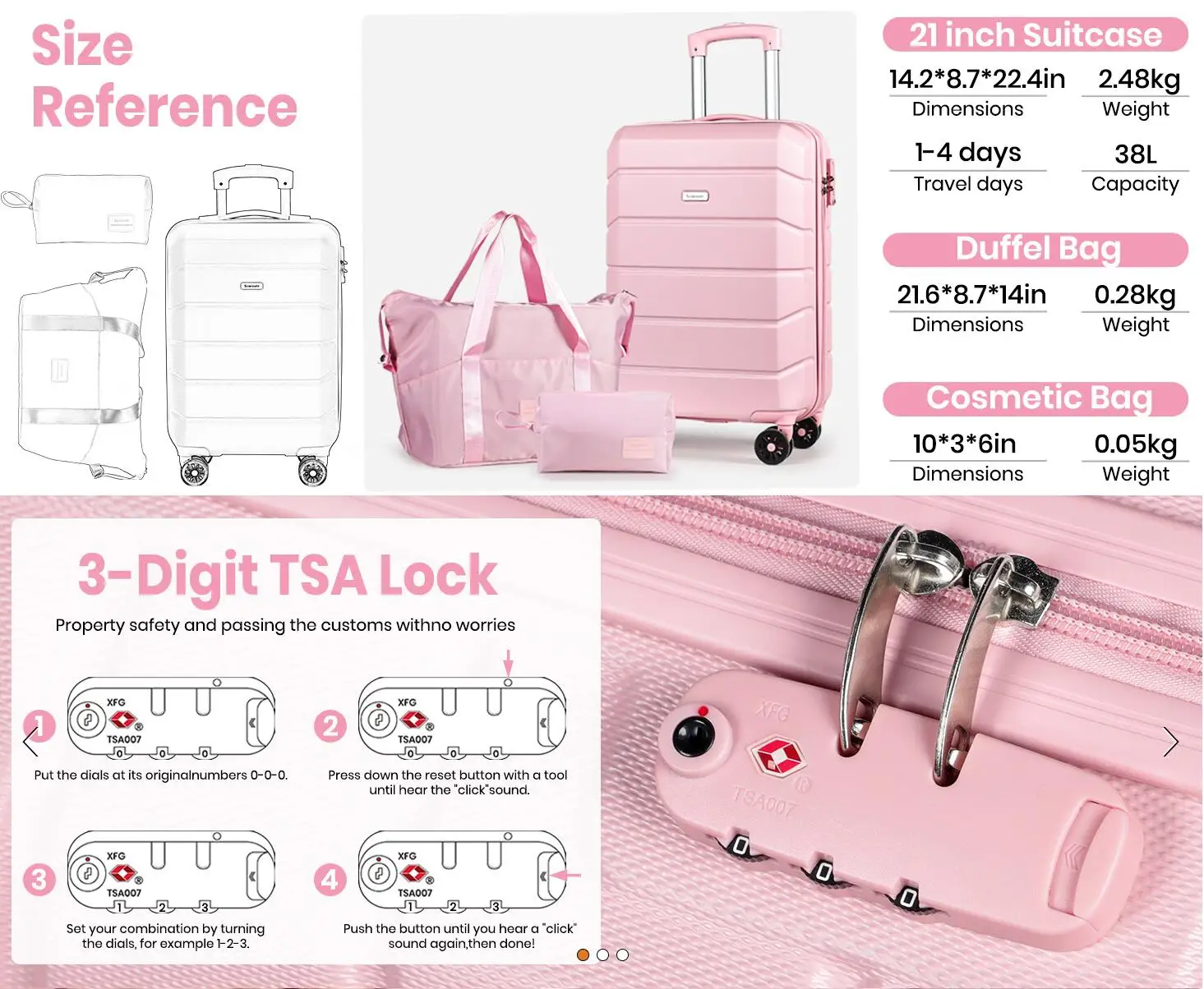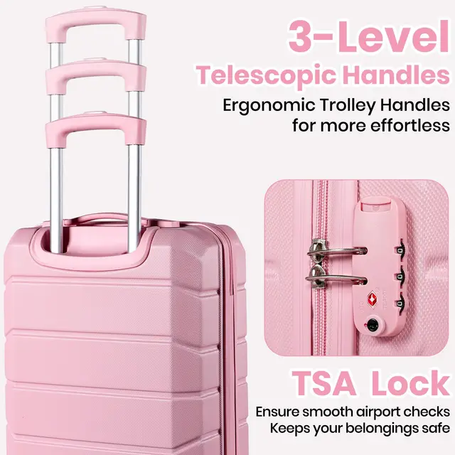 Secure Travel with TSA Lock: The luggage set features a side-mounted TSA lock, ensuring your belongings remain secure during travel. TSA locks allow authorized personnel to inspect your luggage without damaging the lock, providing peace of mind and convenience at customs security checks. If you have any questions about TSA locks or luggage, our customer service team is always ready to assist you, ensuring a hassle-free travel experience.