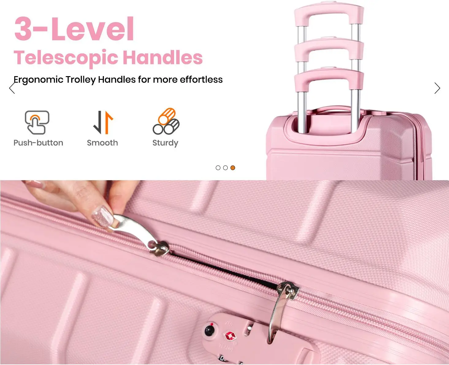 Ergonomic 3-Level Telescopic Handles: Our suitcases feature an ergonomic 3-level telescopic handle, allowing for easy maneuverability in tight spaces. The soft TPU material on the top provides a comfortable grip, reducing finger strain during travel. With a focus on user comfort and convenience, our luggage set is designed to make your journey as smooth and enjoyable as possible. Plus, enjoy the added benefit of a 1 year worldwide warranty for worry-free purchasing.