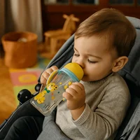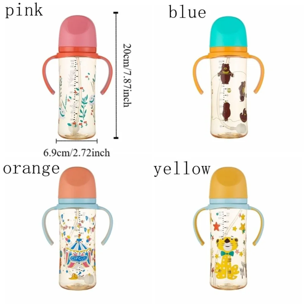 Cartoon Baby Milk Bottle with Handle Animal Pattern Baby Feeding Bottle Easy Grip Transparent Newborn