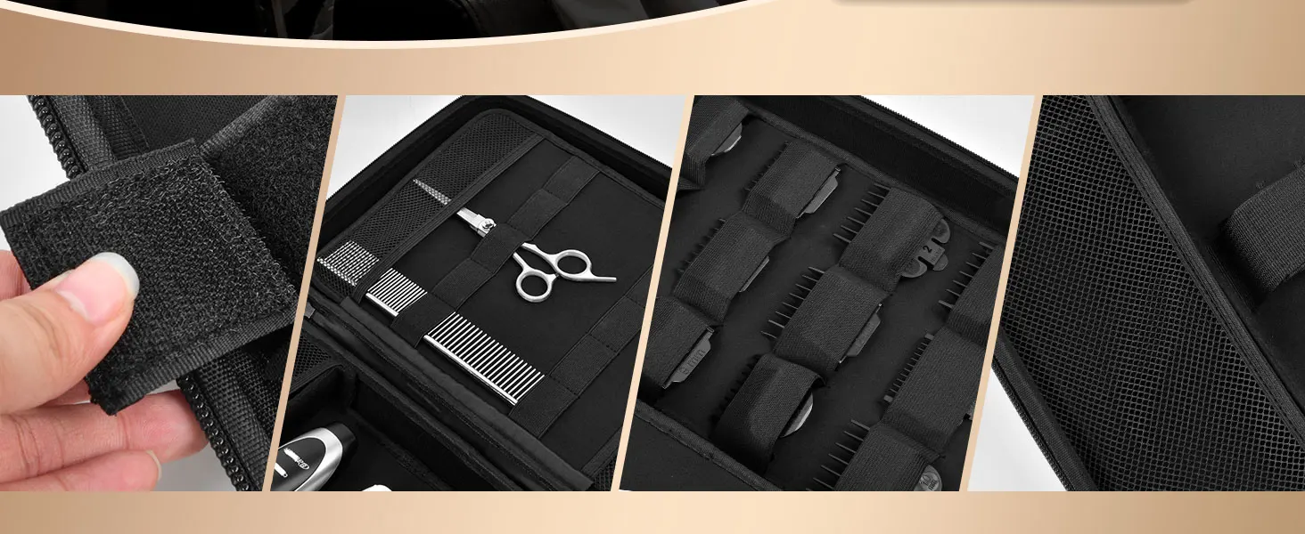 Large Capacity Hair Shears Storage: Barber clippers storage bag with top cover is ingeniously designed to accommodate 12 limit combs of varying sizes, catering to diverse hair-cutting requirements. Ample base is capable of holding four clippers, bottom with a mesh pocket and partition system that efficiently separates tools and accessories, maintaining an organized interior. Adjustable Velcro straps allow for secure placement of shavers of different sizes, ensuring a snug fit for every tool.