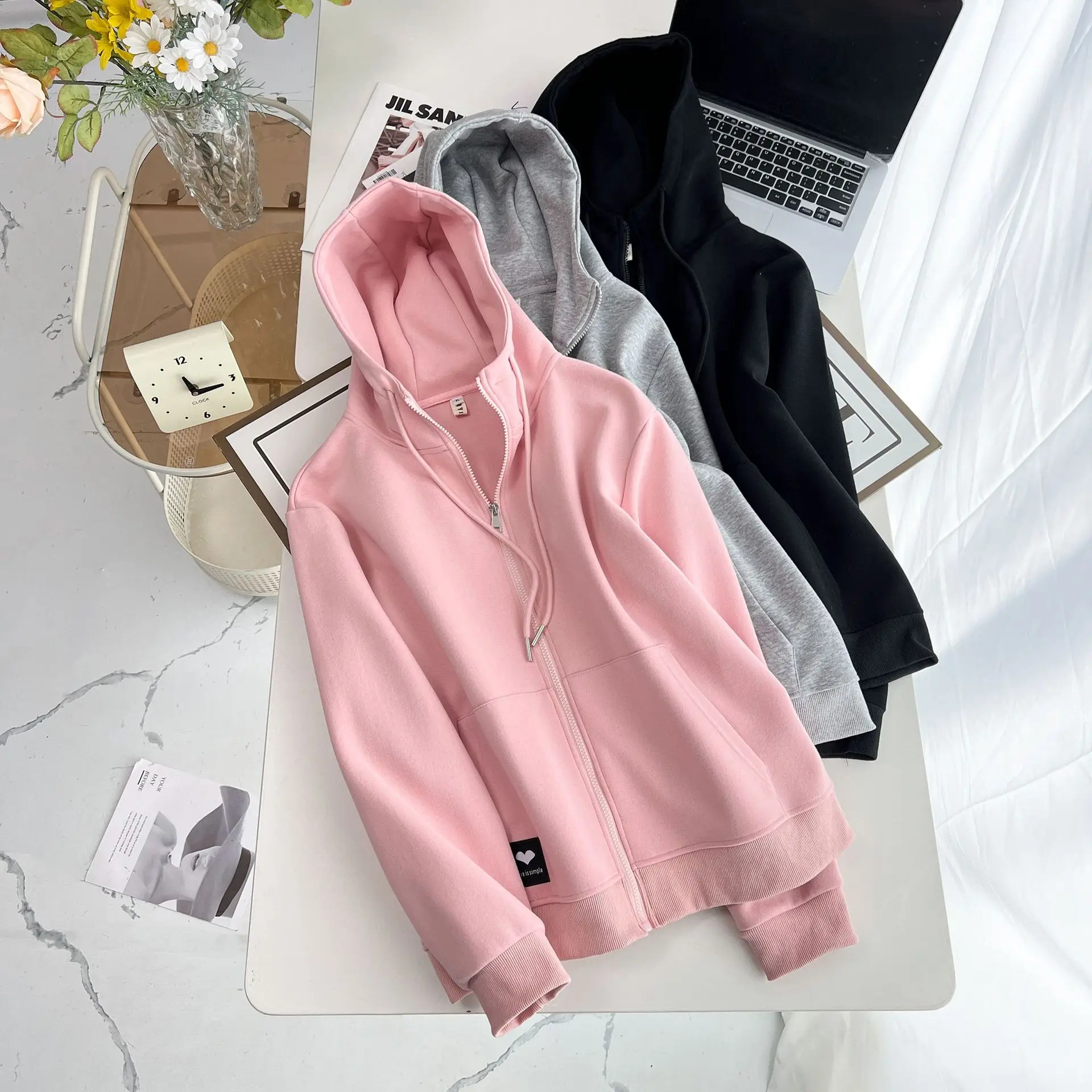 Featuring a trendy hood and heart-shaped label, this jacket adds a youthful touch to any casual outfit.