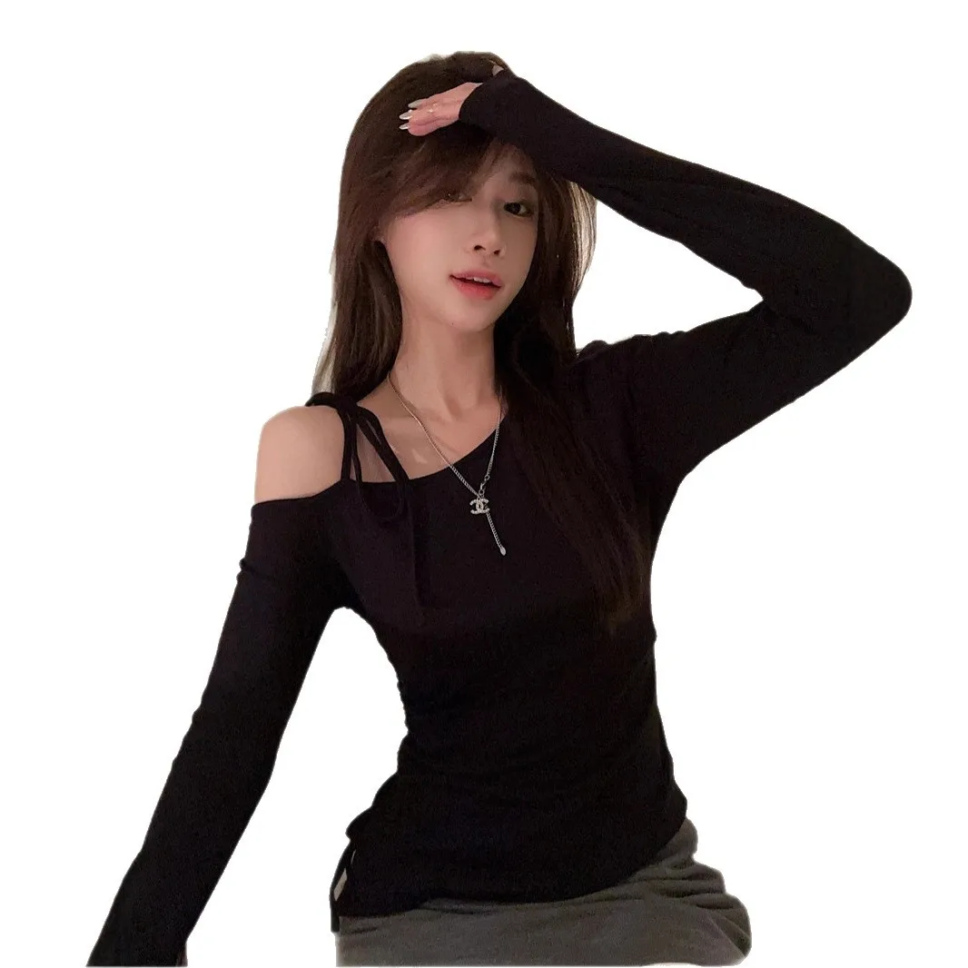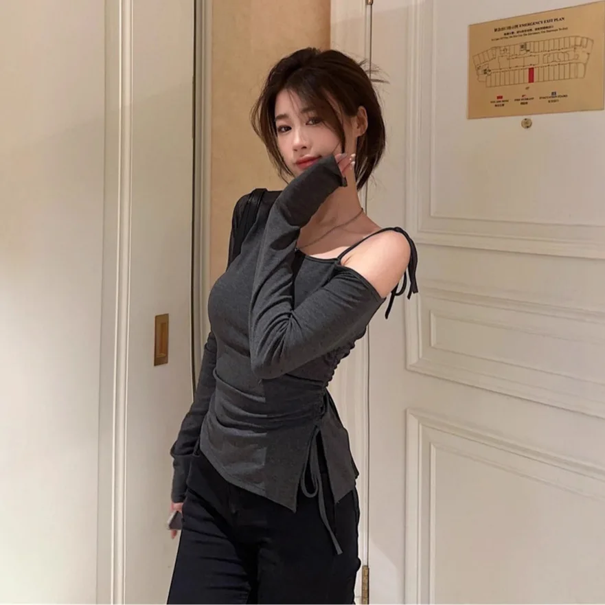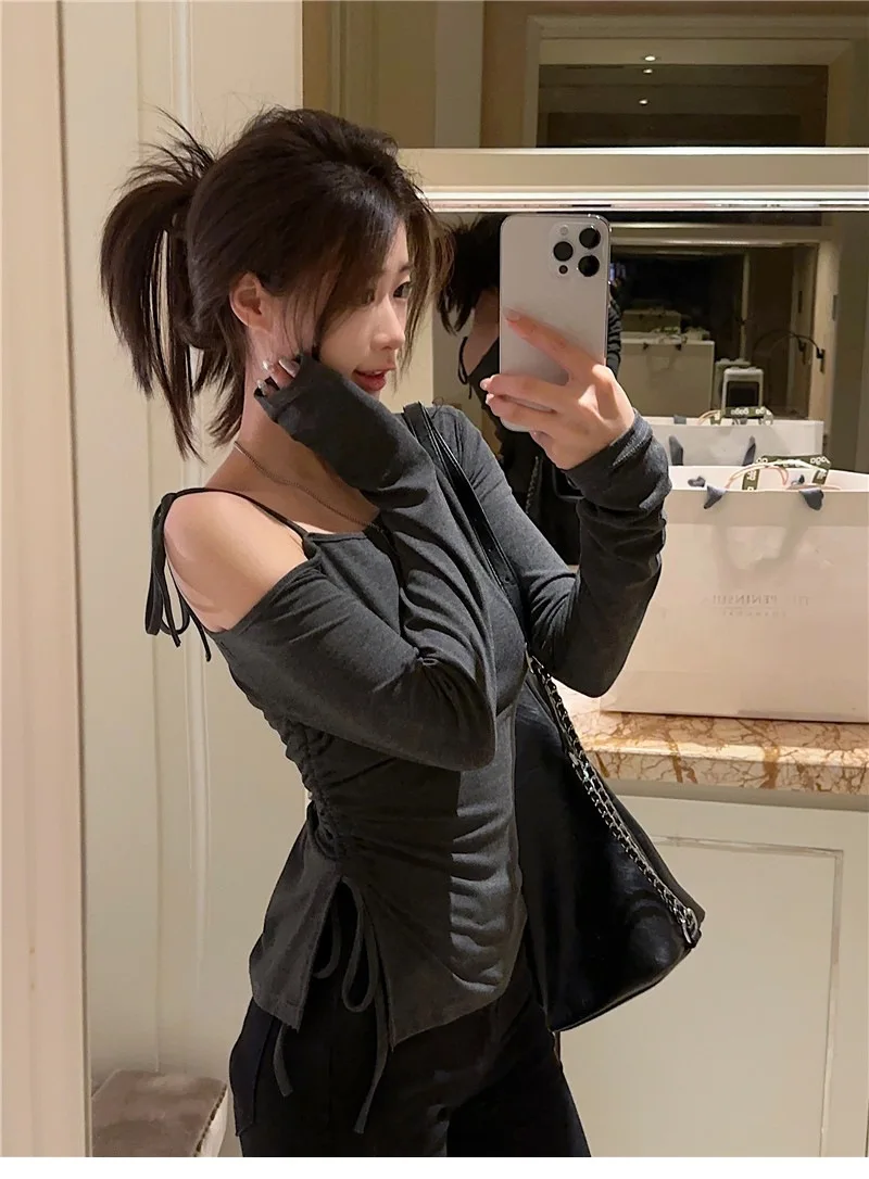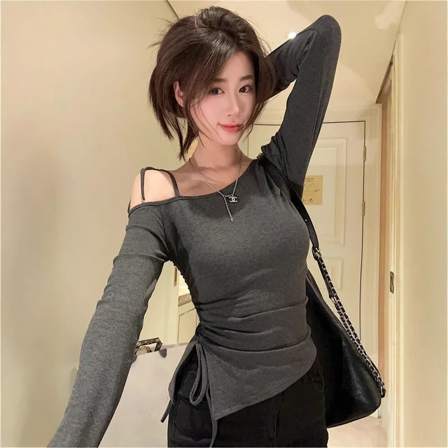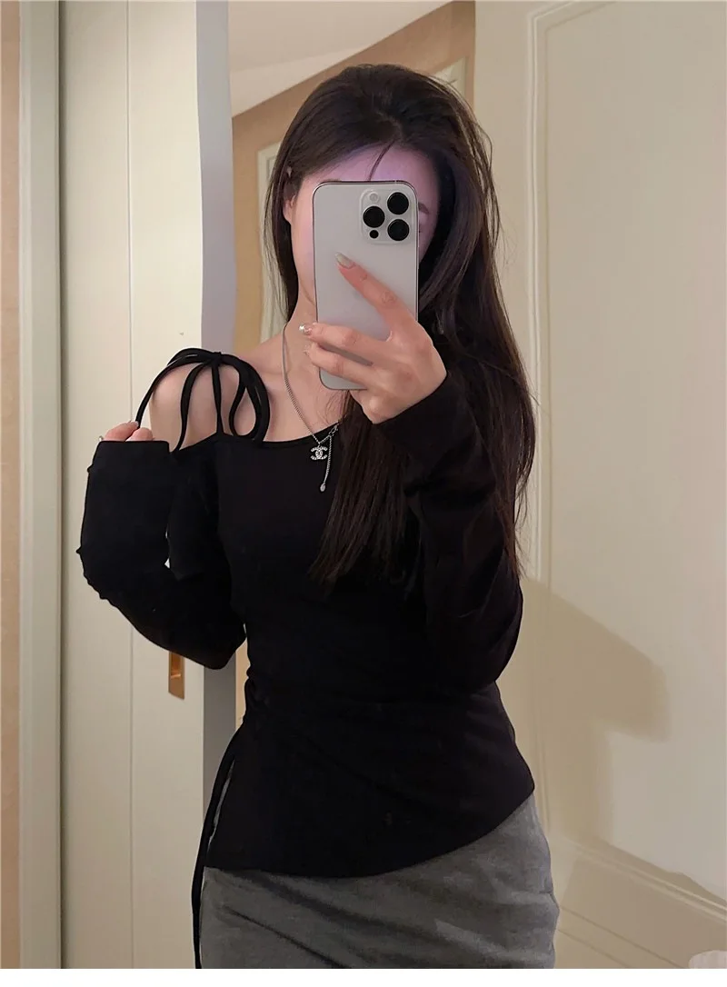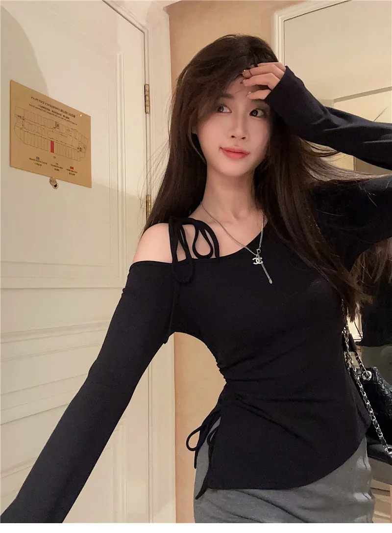 Chic Drawstring Shoulder Bared Long Sleeve T Shirt Women’s Autumn 2025 New Pure Desire Sexy Short