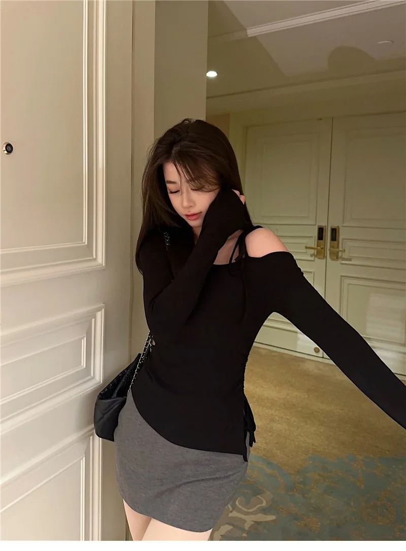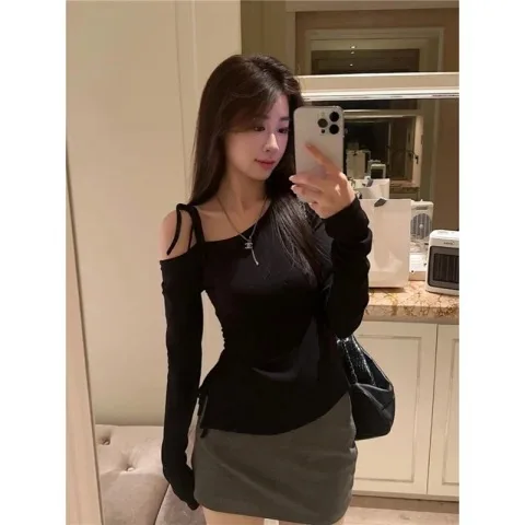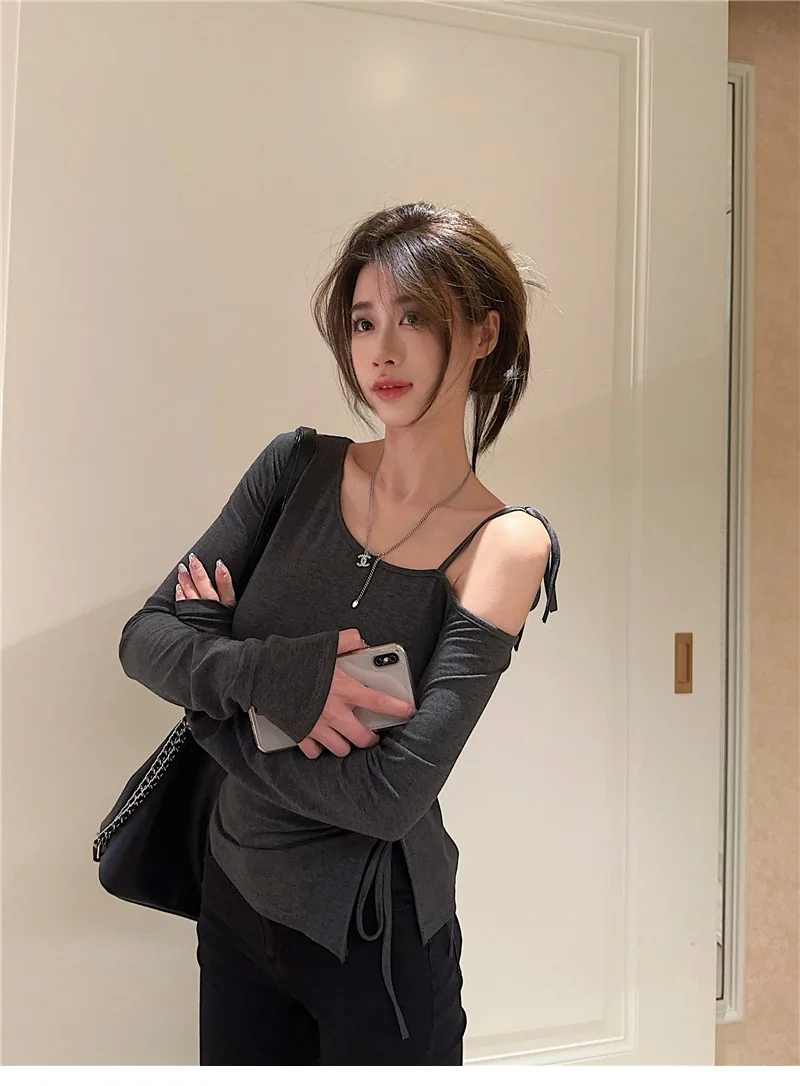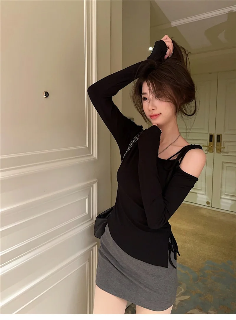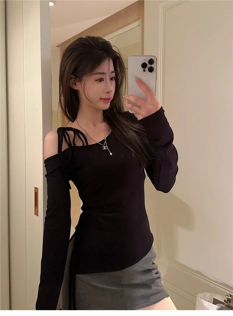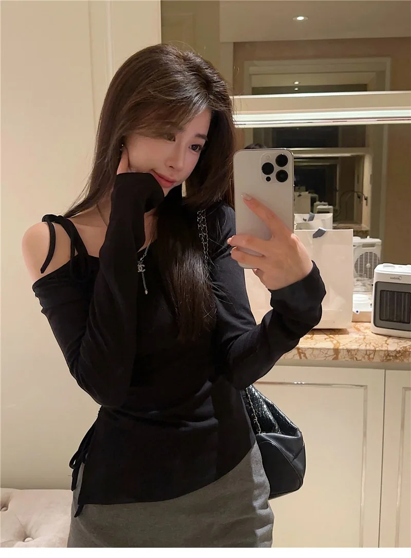 Chic Drawstring Shoulder Bared Long Sleeve T Shirt Women’s Autumn 2025 New Pure Desire Sexy Short