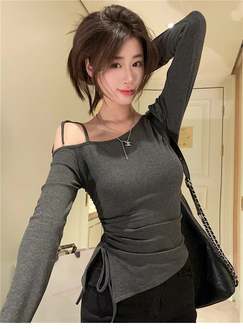 Chic Drawstring Shoulder Bared Long Sleeve T Shirt Women's Autumn 2025 New Pure Desire Sexy Short Irregular Top for Women