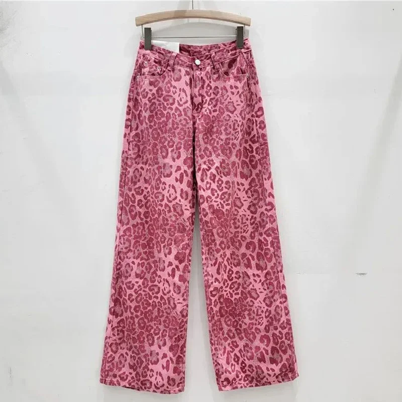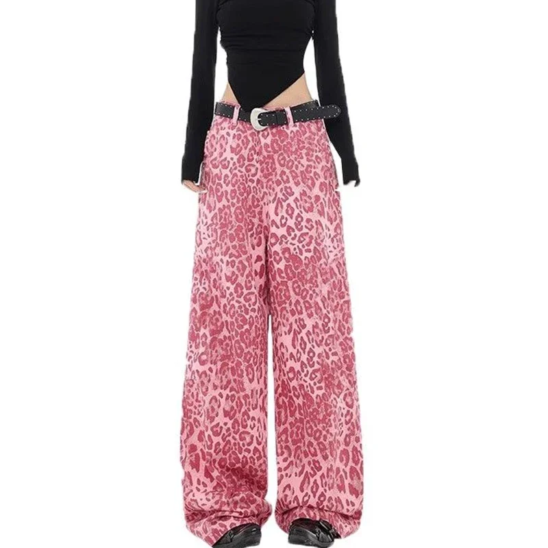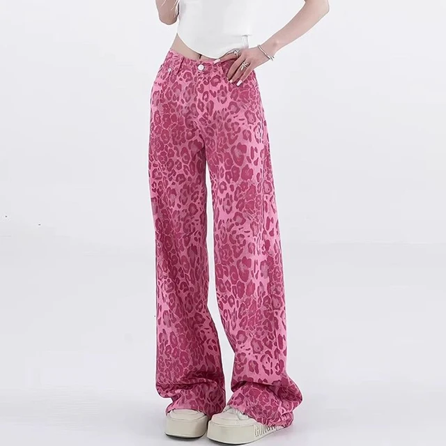 Chic Fashion Girls Leopard Print Jeans Lady Korean Casual High Waist Pants Female Pink Baggy Straight Leg Denim Trousers