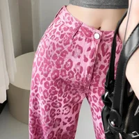 Chic Fashion Girls Leopard Print Jeans Lady Korean Casual High Waist Pants Female Pink Baggy Straight