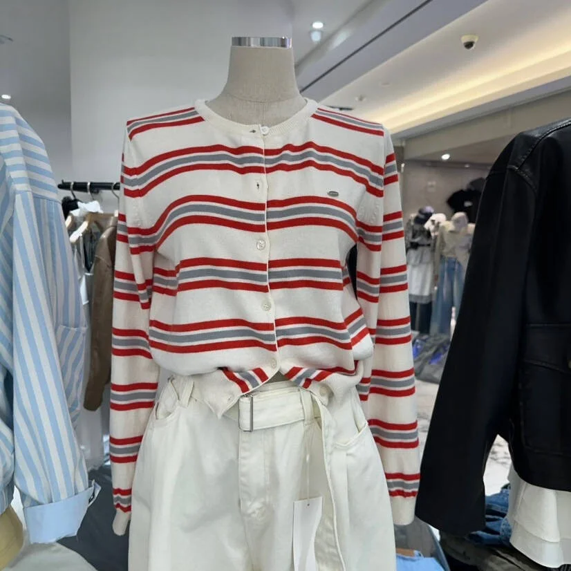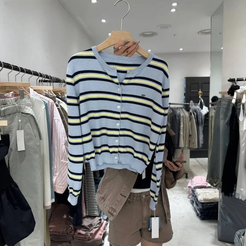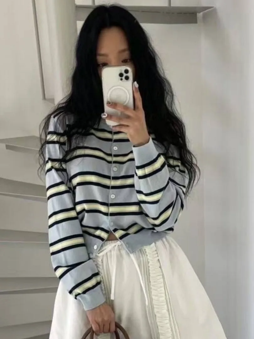 Chic Spring New Classic Striped round Ne Button up Knitted Open Cardigan Soft Color Blo Design Women’s