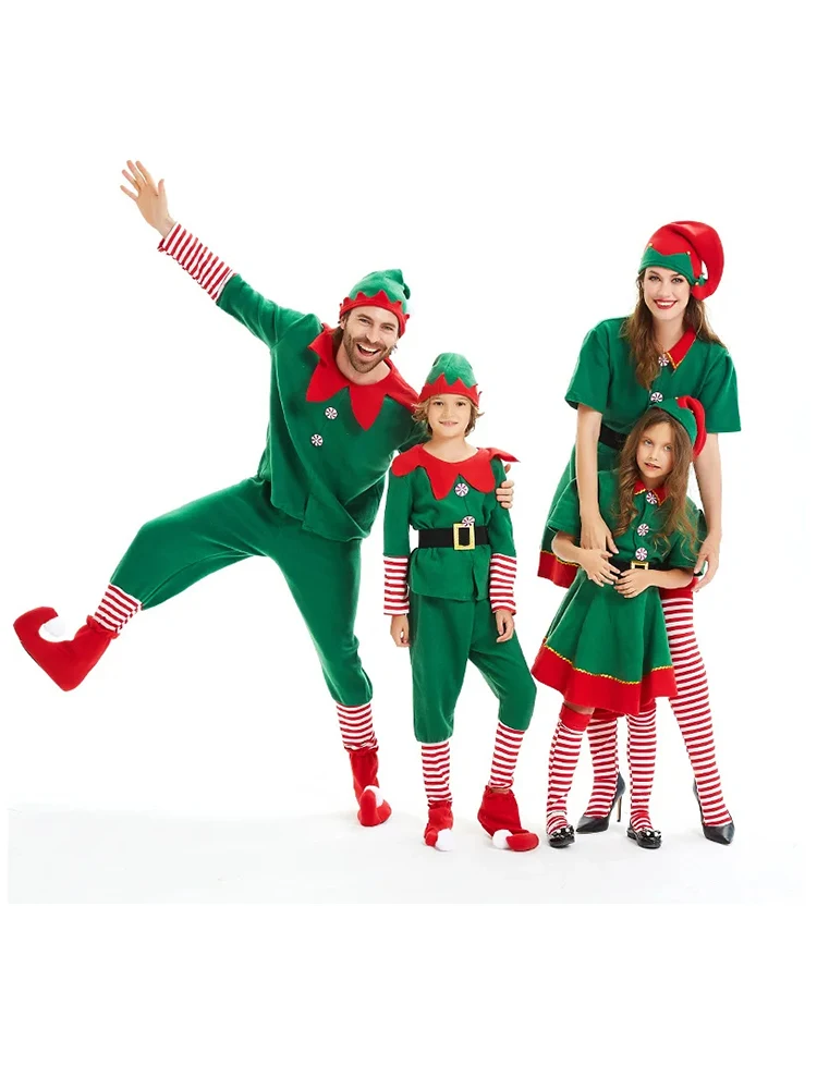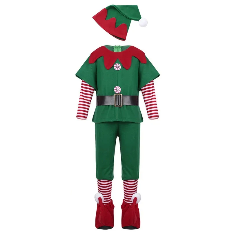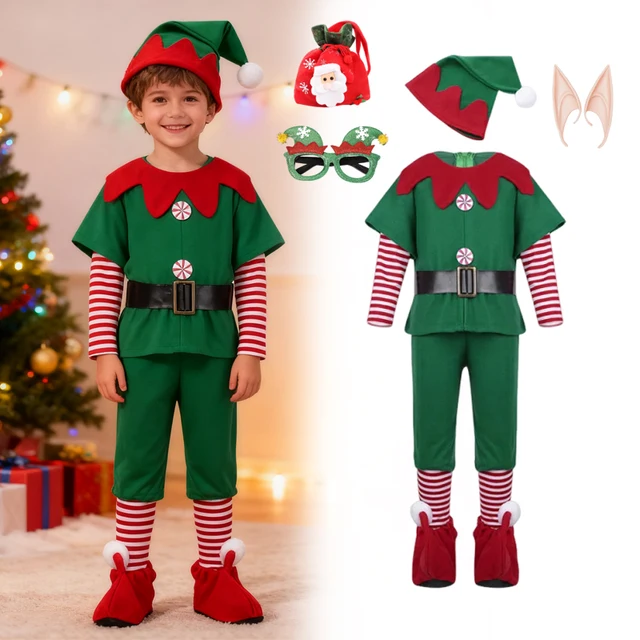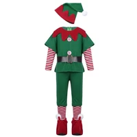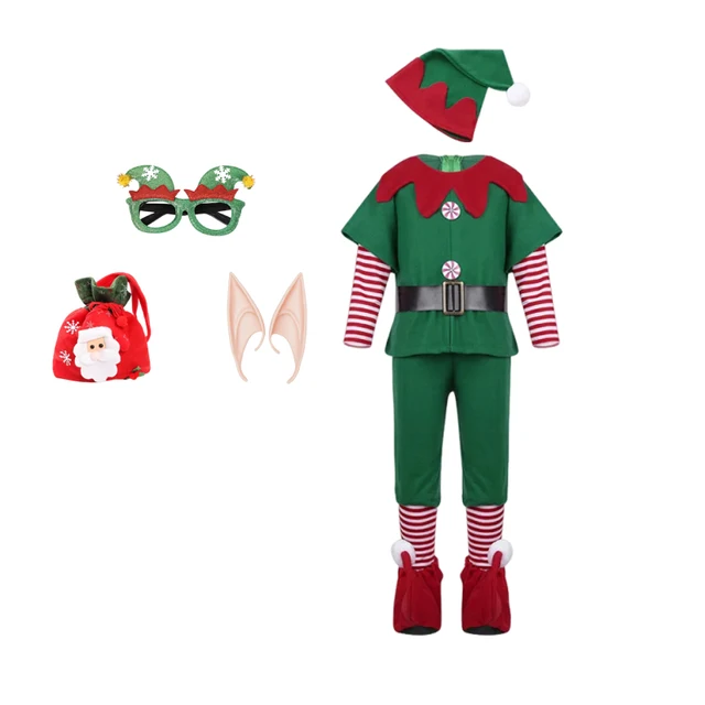 Children Boy Christmas Elf Cosplay Costume Top + Pants Belt Hat Shoes Matching Dress Up Santa Claus New Year Party Outfit