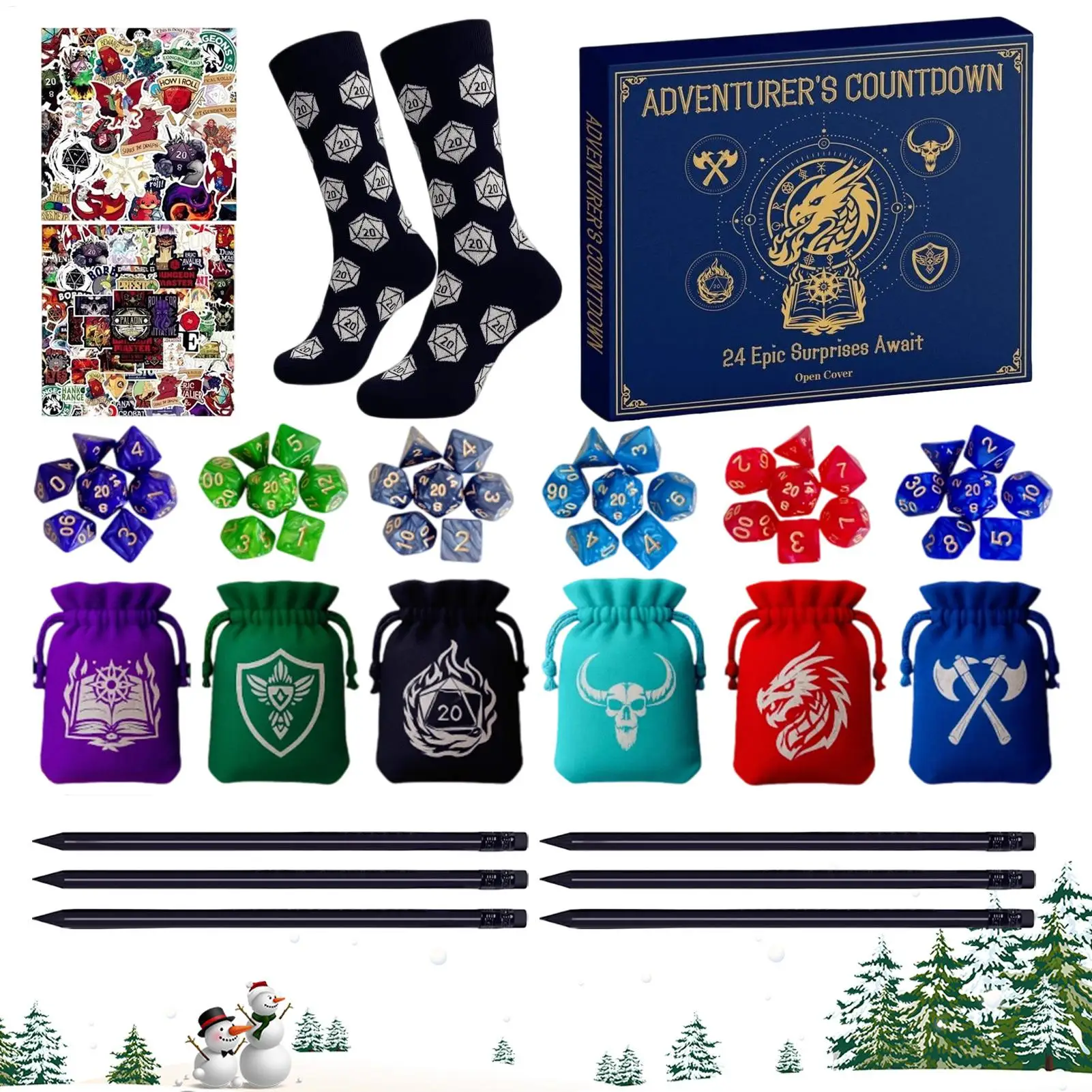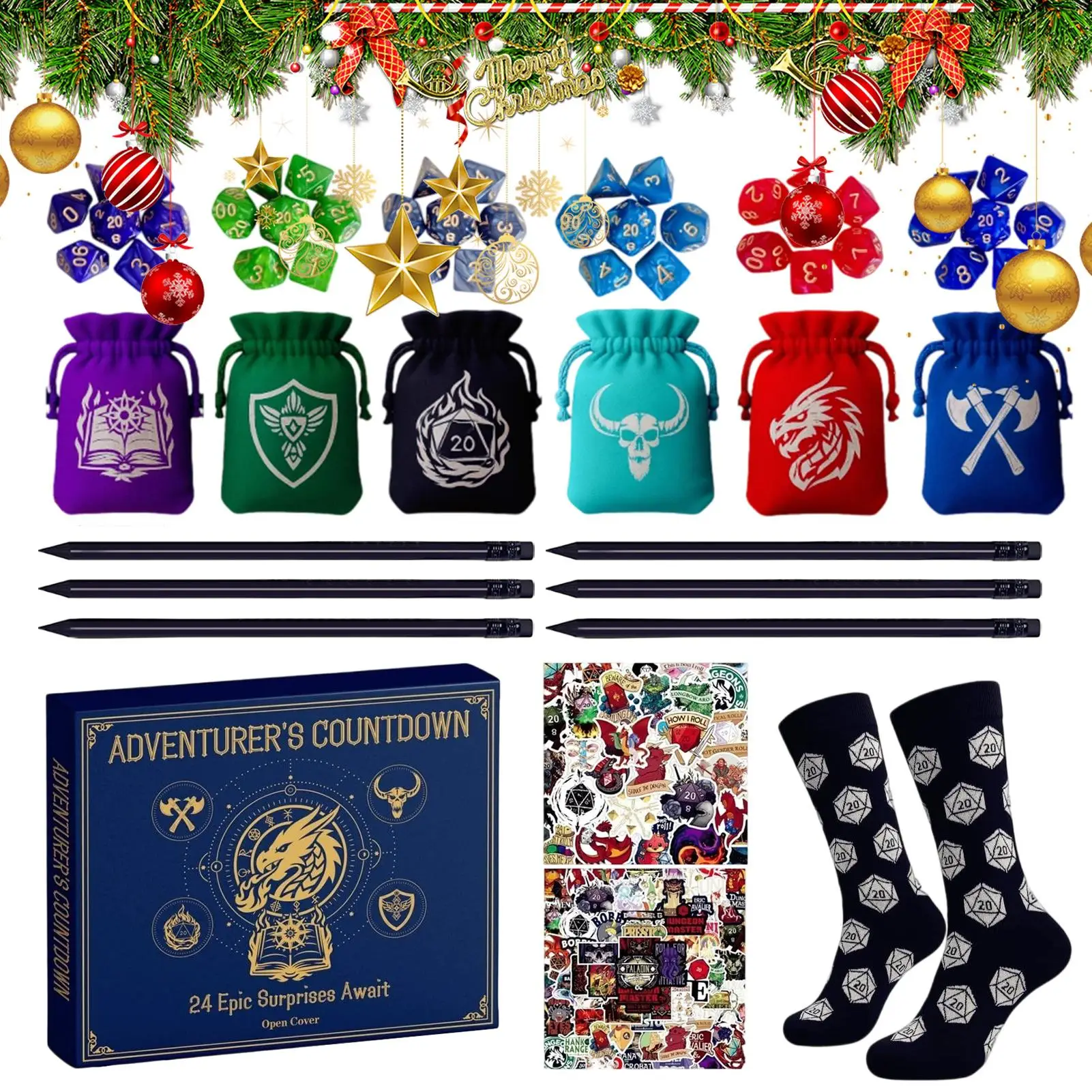 Christmas Advent Calendar with Polyhedral Dice Pouches Necklaces Stickers Socks Funny Christmas Gifts