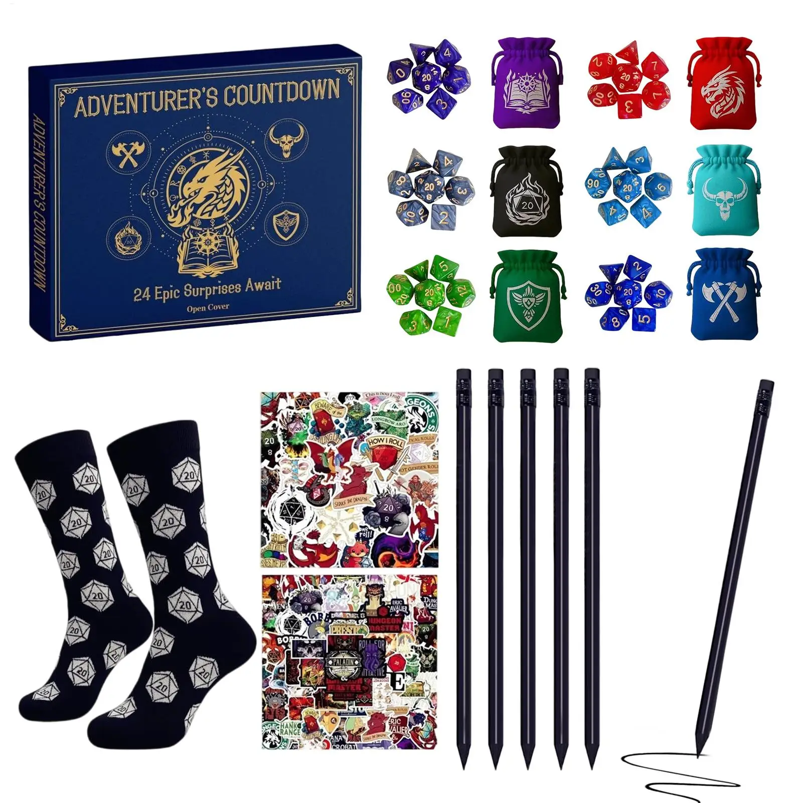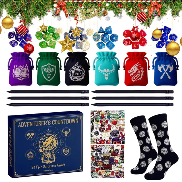 Polyhedral dice sets and stickers make this countdown calendar perfect for holiday celebrations or daily family activities. Socks, necklaces, pencils, and pouches add excitement while being ideal party favors or stocking stuffers. Suitable for adults, kids, and teens, it enhances home, school, and classroom engagement during festive seasons and parties.