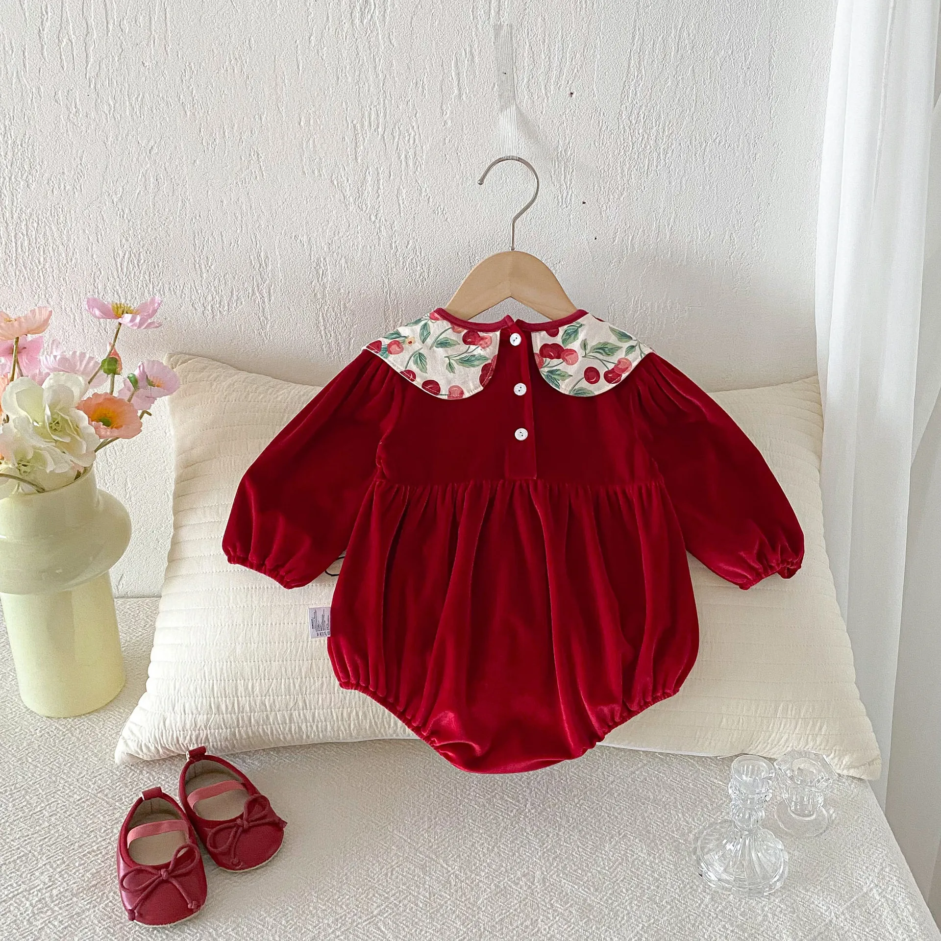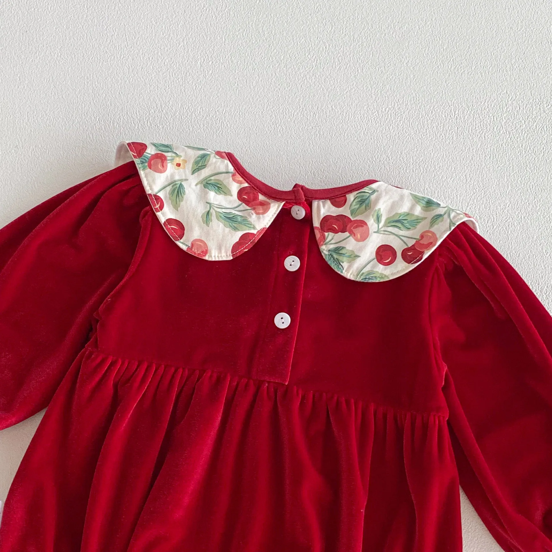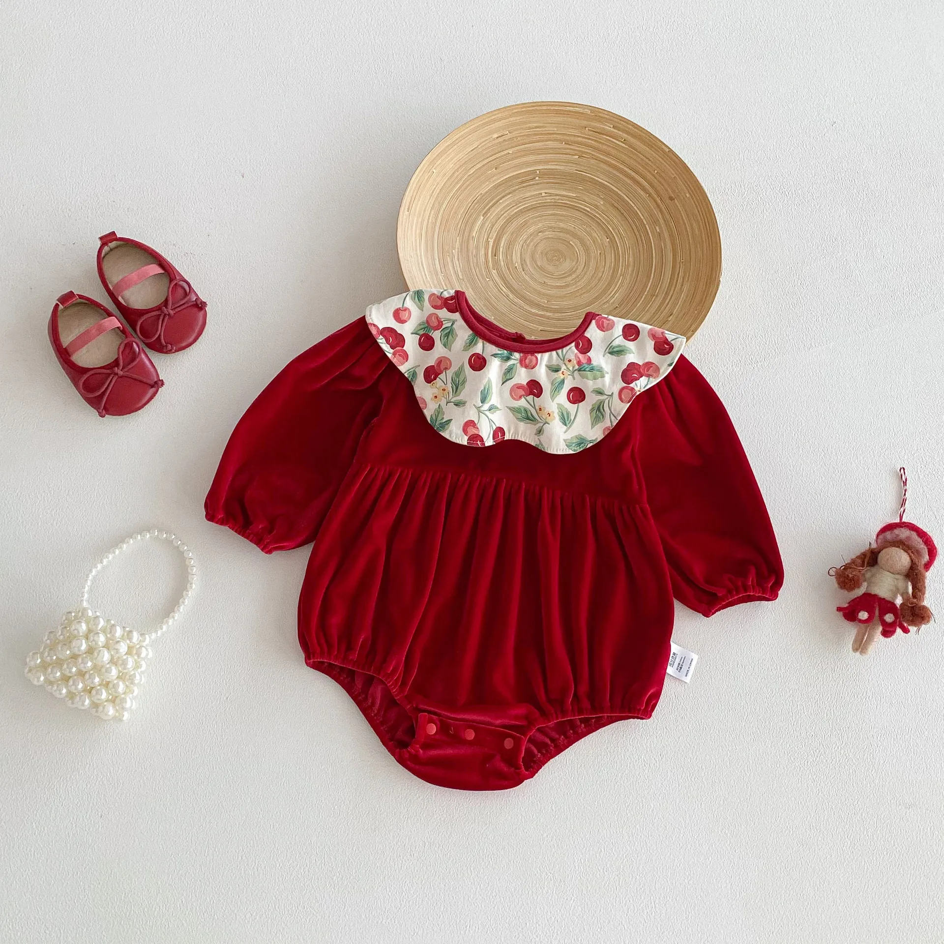 Christmas Baby Girls Outfit Romper Cherry Print Collar Jumpsuit New Years Red Romper Xmas Bodysuits Fall Winter Child Clothes