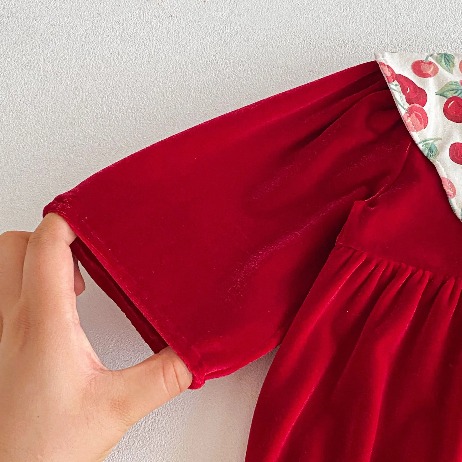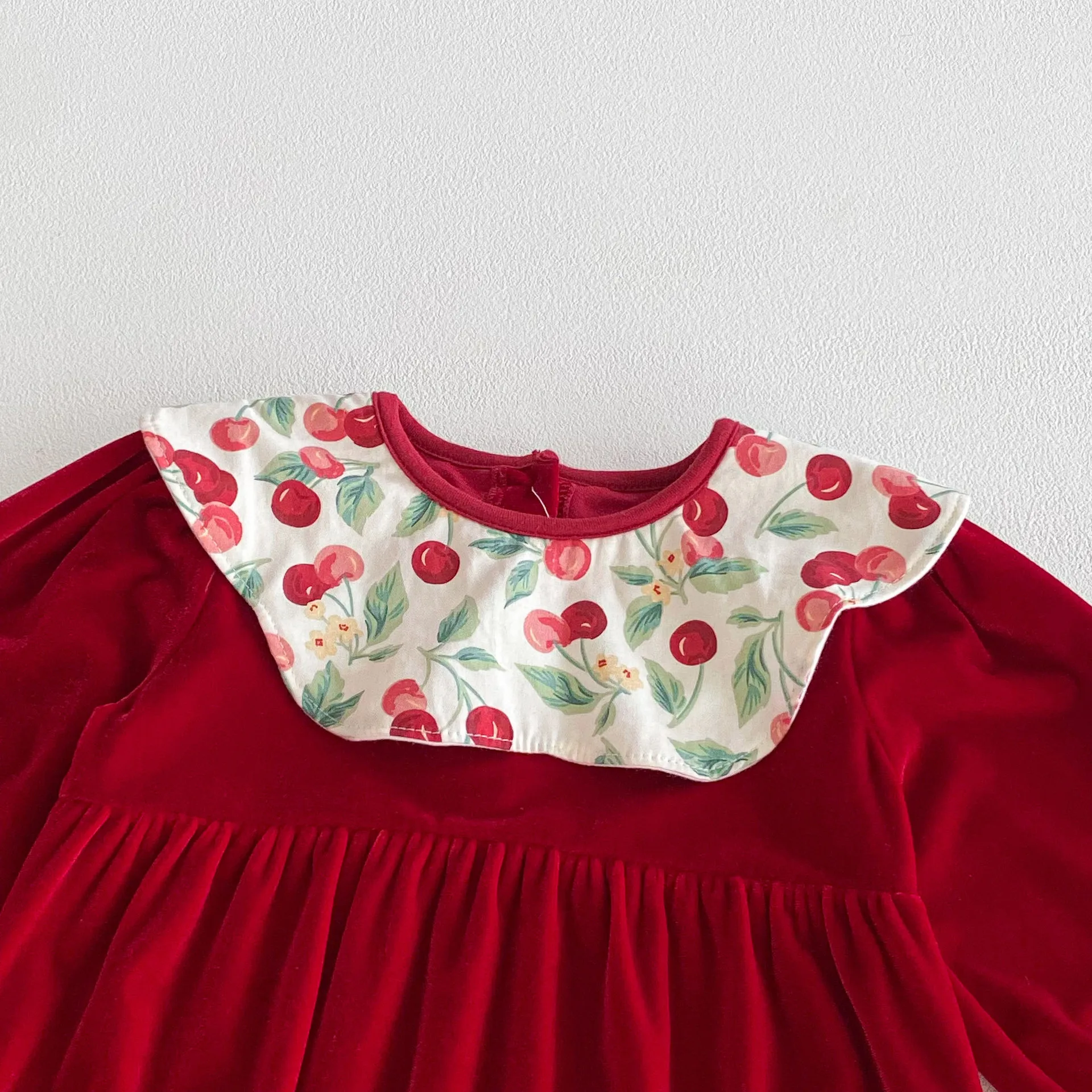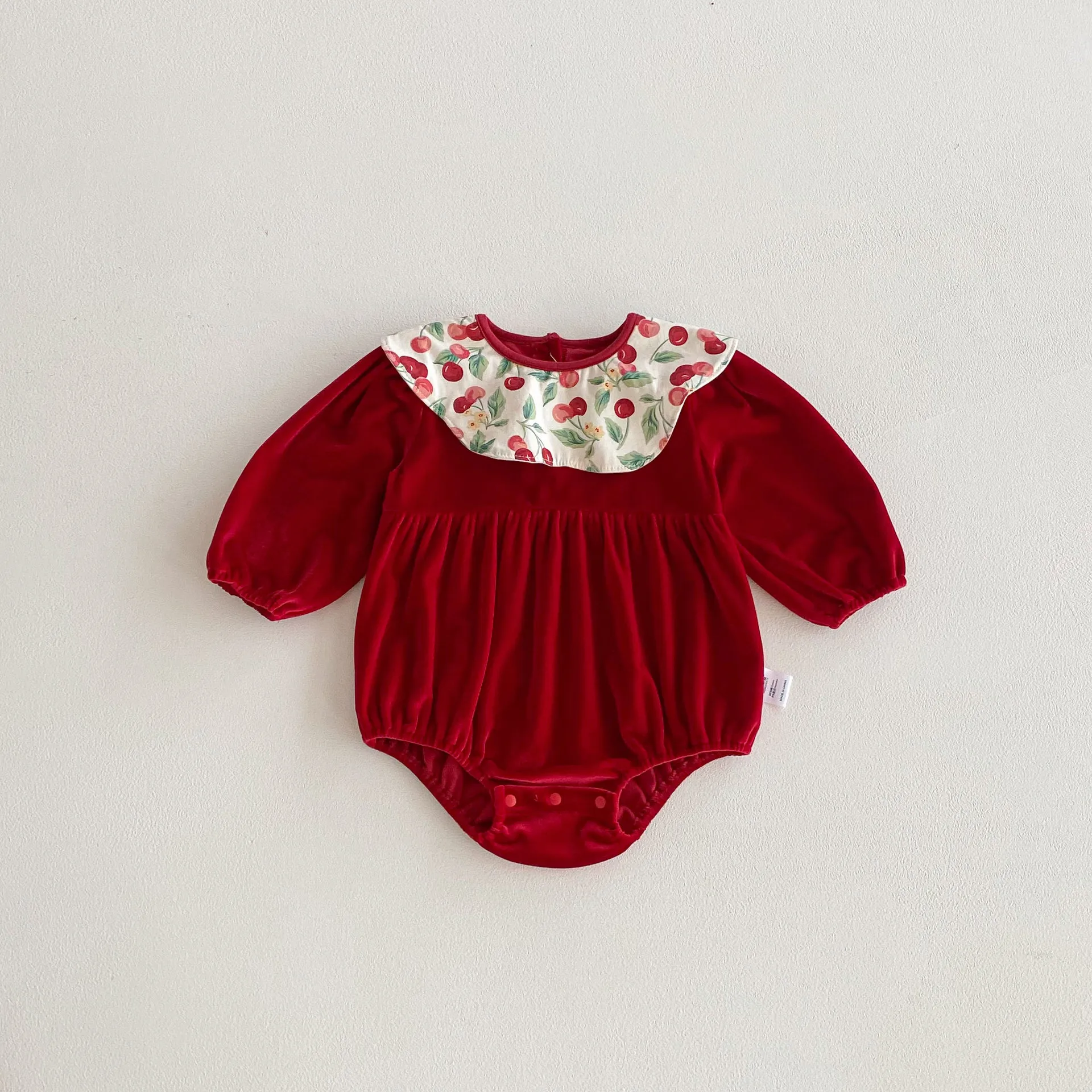 Christmas Baby Girls Outfit Romper Cherry Print Collar Jumpsuit New Years Red Romper Xmas Bodysuits Fall Winter Child Clothes