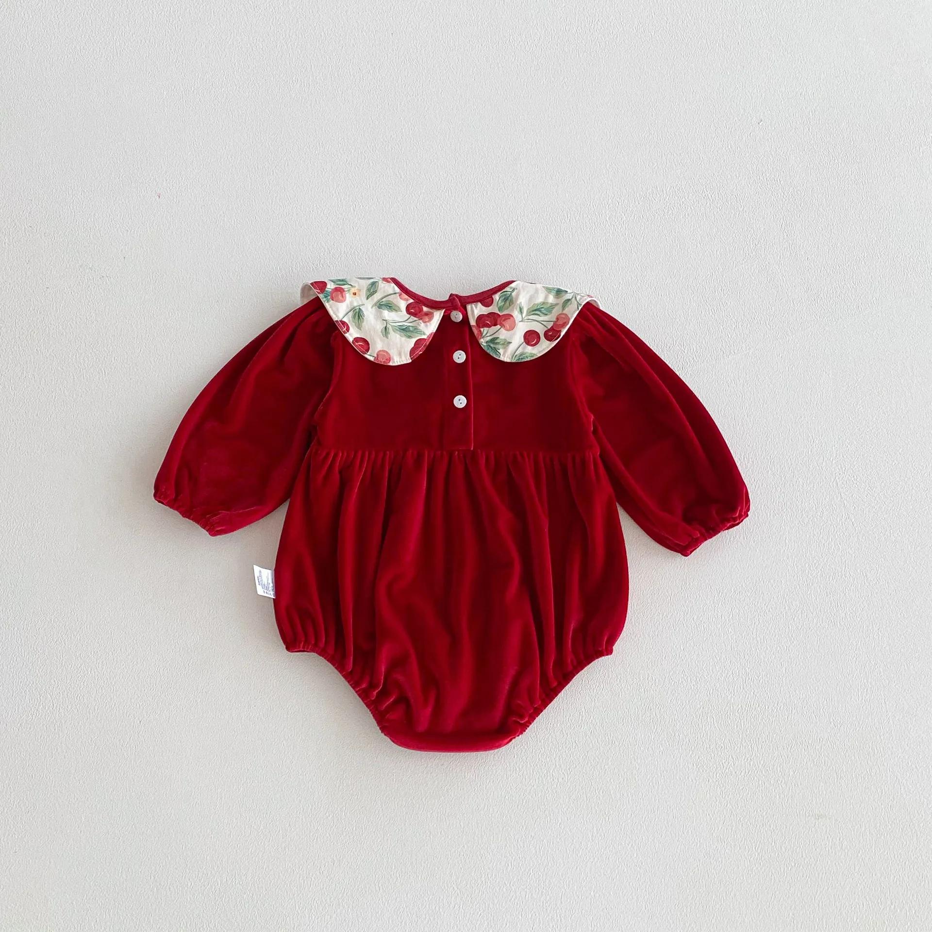 Christmas Baby Girls Outfit Romper Cherry Print Collar Jumpsuit New Years Red Romper Xmas Bodysuits Fall