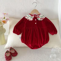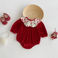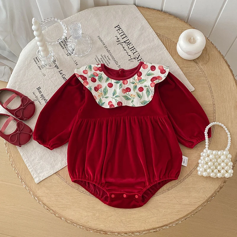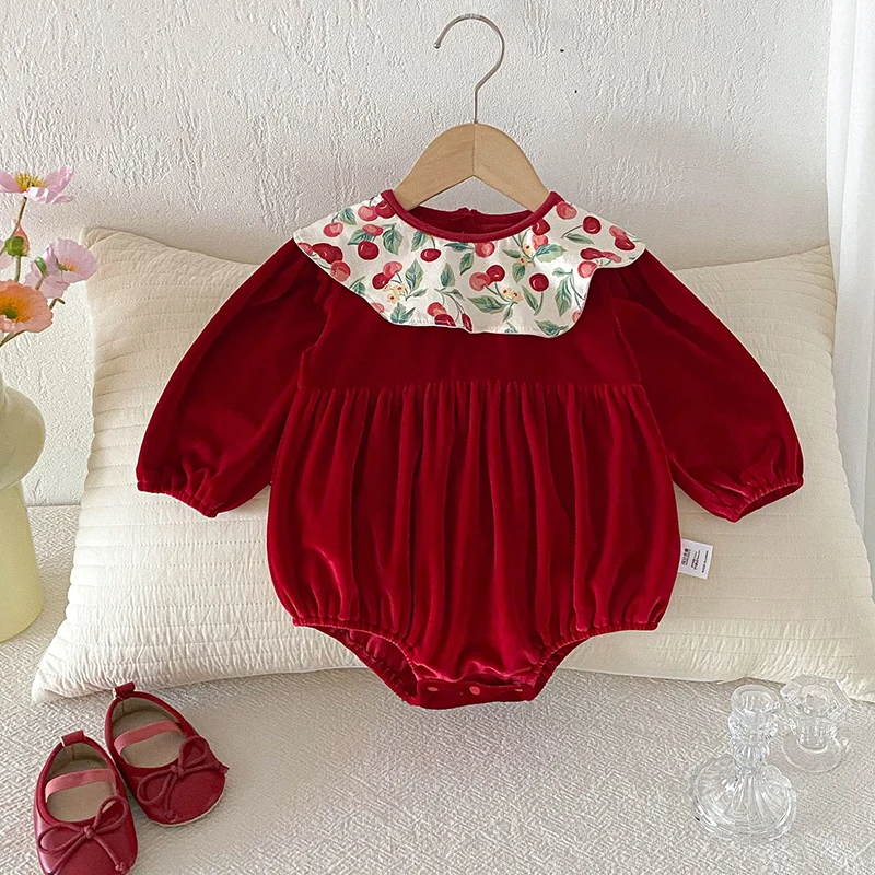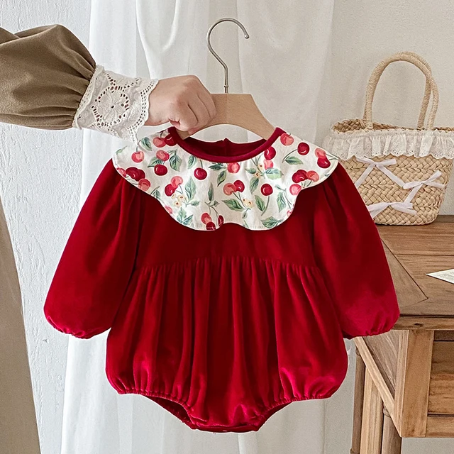 Christmas Baby Girls Outfit Romper Cherry Print Collar Jumpsuit New Years Red Romper Xmas Bodysuits Fall