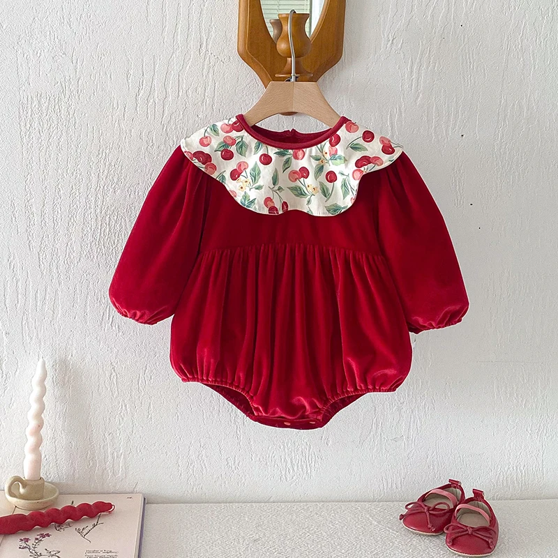 Christmas Baby Girls Outfit Romper Cherry Print Collar Jumpsuit New Years Red Romper Xmas Bodysuits Fall Winter Child Clothes