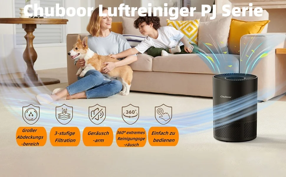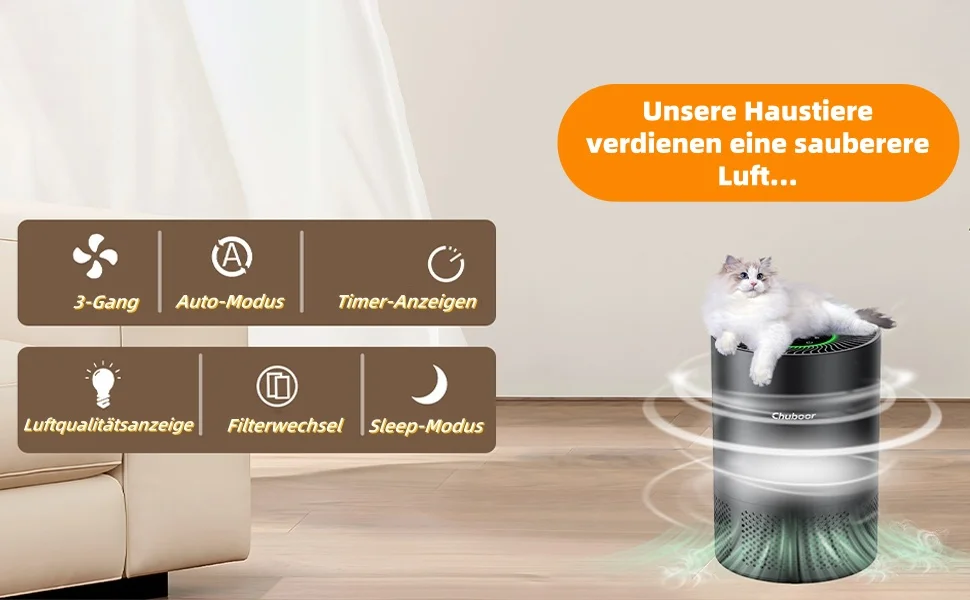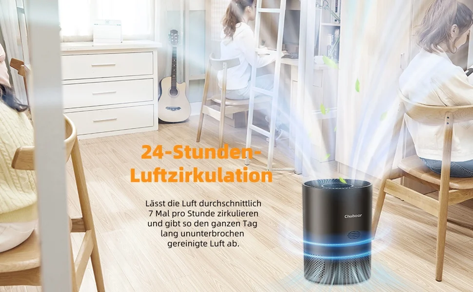 Smart Auto Mode & Child Lock Replace Filter Reminder: The air purifier features intelligent filter monitoring, allowing you to check the status of the HEPA filter at any time via the mobile app or by observing the filter indicator on the device (a red light signals replacement). Depending on the environment and usage, we recommend replacing the filter every 3 to 4 months. For optimal cleaning performance, we strongly recommend using genuine Chuboor replacement filters.