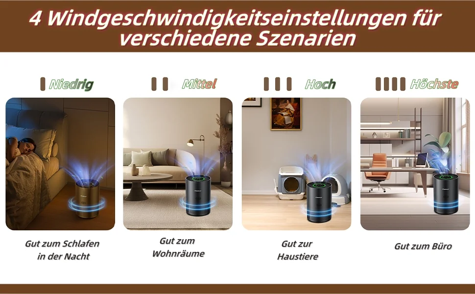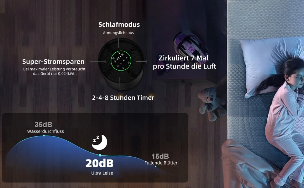 1:Air purifier: Air purifier: With a CADR (Clean Air Delivery Rate) of 185m³/h, the air purifier is suitable for rooms up to 110m², refreshes a 15m² bedroom every 7 minutes, a 30m² living room or office every 17 minutes, and a 100m² room 1.5 times per hour. The maximum power consumption is 24W, and at its highest setting, the device uses only 0.024kWh. The air purifier’s 360° air intake design cleans the air in all directions and releases clean, healthy air.