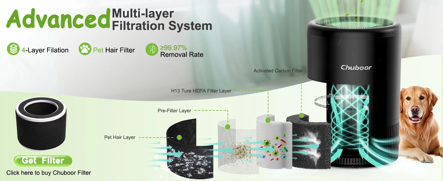 🧽【𝐄𝐟𝐟𝐞𝐜𝐭𝐢𝐯𝐞 𝐏𝐮𝐫𝐢𝐟𝐢𝐜𝐚𝐭𝐢𝐨𝐧】The Air Purifier for home features 4-stage high-efficiency filtration system(pet hair adsorption layer,pre-filter, true HEPA filter, activated carbon filtEfficiently cleans the air by eliminating unpleasant odors.It also offers 5 purification speed settings (Auto, I, II, III, Sleep), allowing you to choose the most suitable mode based on indoor air quality for fast and efficient air purification.